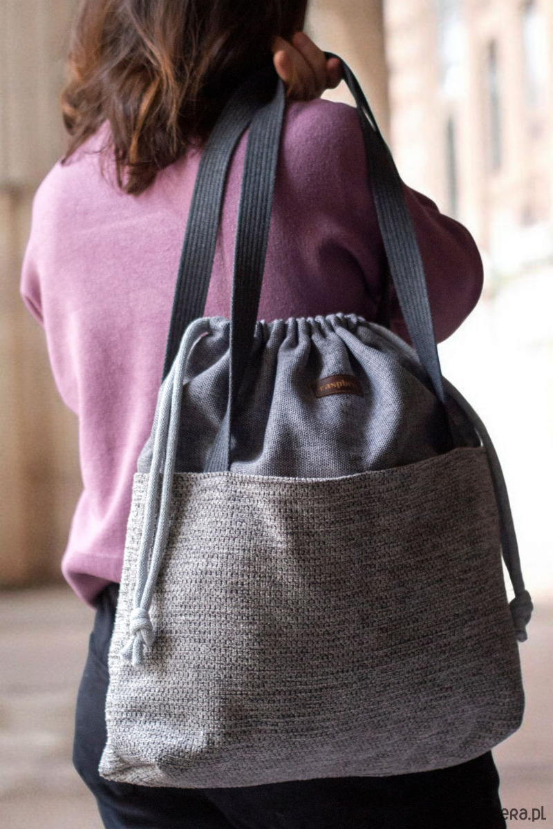 Torba worek ściągana grubym sznurem bawełnianym w rozmiarze XL. Z przodu dwie kieszenie, w środku kieszonka zapinana na suwak. Sznurek w kolorze szarym.