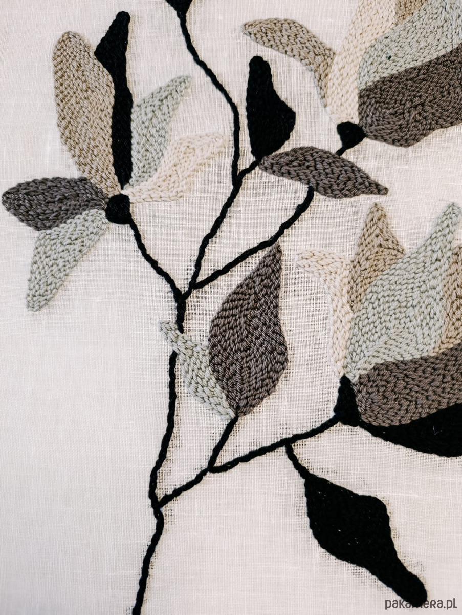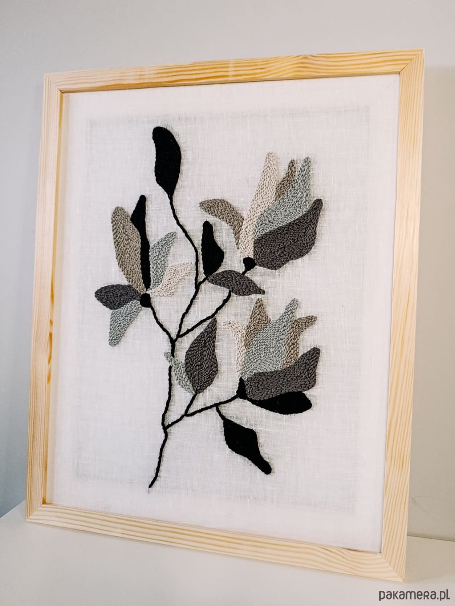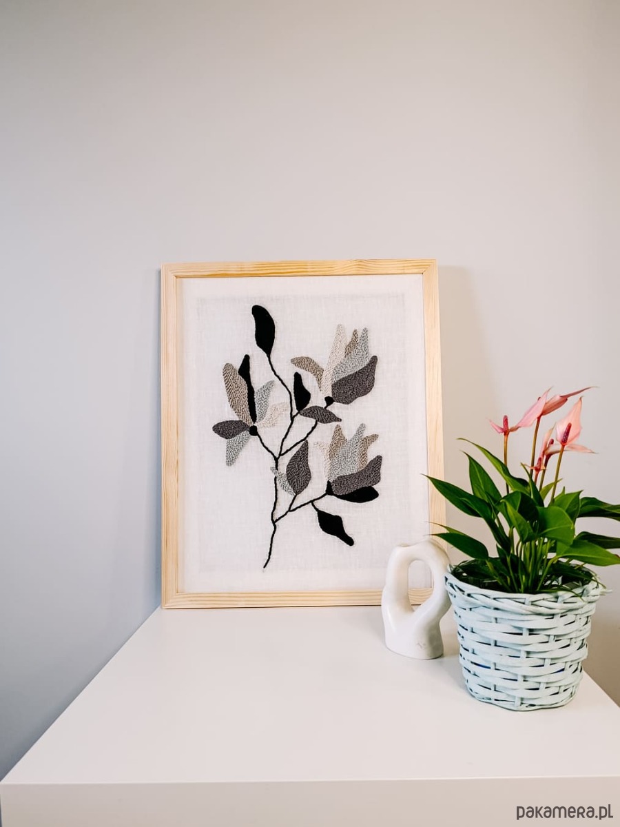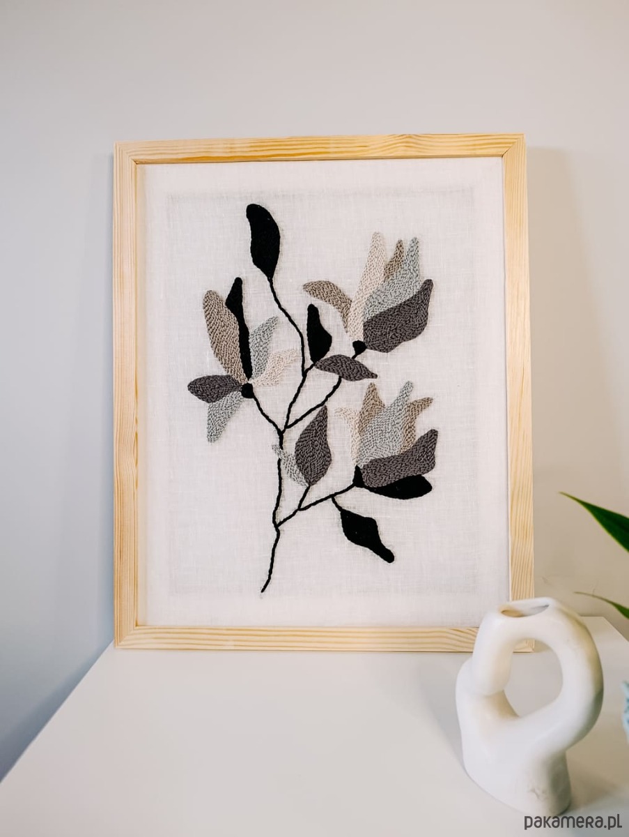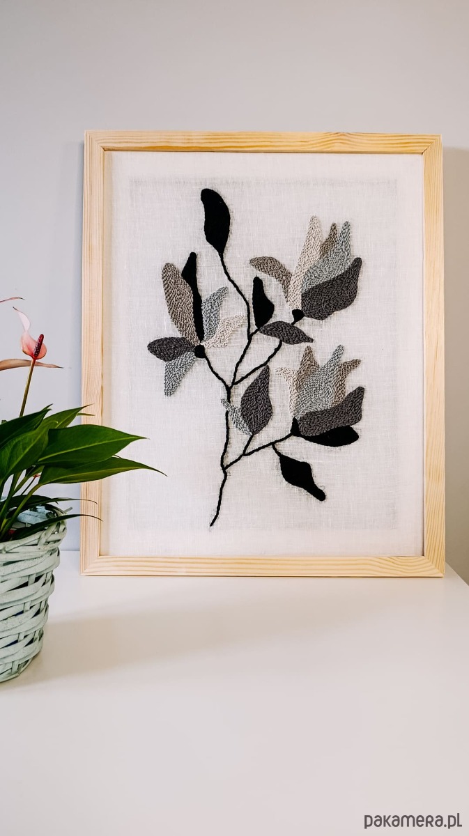 „Szara godzina” – ręcznie wykonana dekoracja ścienną w technice punch needle doda Twojemu wnętrzu elegancji. Minimalistyczna kompozycja liści w odcieniach szarości, czerni i beżu emanuje spokojem , bezpieczeństwem i harmonią. Oraz idealnie wpisuje się w styl boho, scandi, minimalistyczny czy nowoczesny.