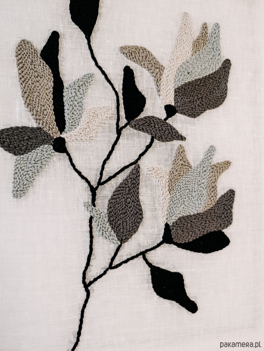 Ten obraz powstał w bezsenną noc. Choć czerń spowijała świat za oknem, czułam spokój i bezpieczeństwo. Mam nadzieję, że te emocje zostały zaklęte w bawełniane nitki.