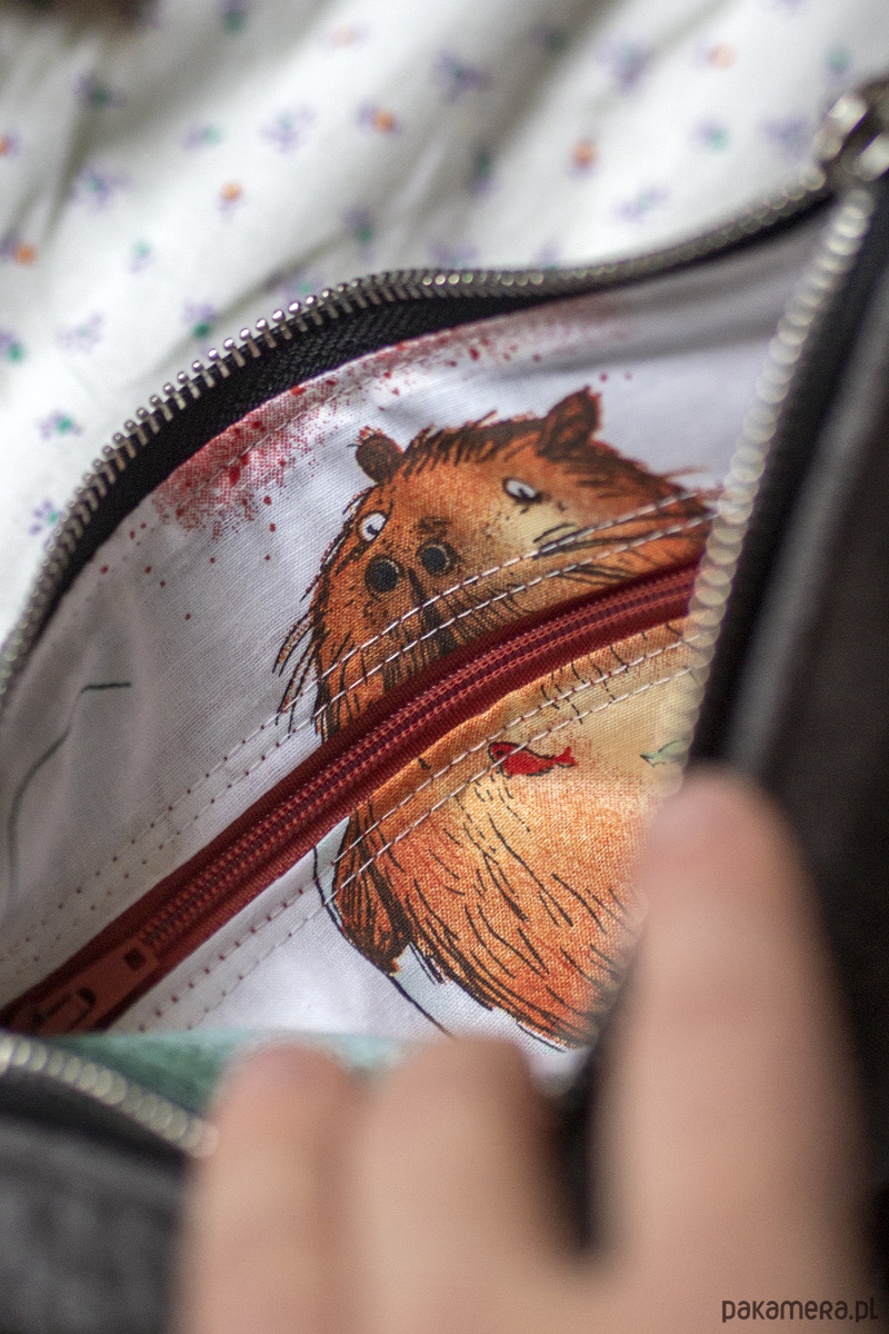 Małe zaszewki na dnie. Z tyłu oraz w środku torebki kieszonki zapinane na suwak. Środek wykończony białą bawełnianą podszewką w kapibary.