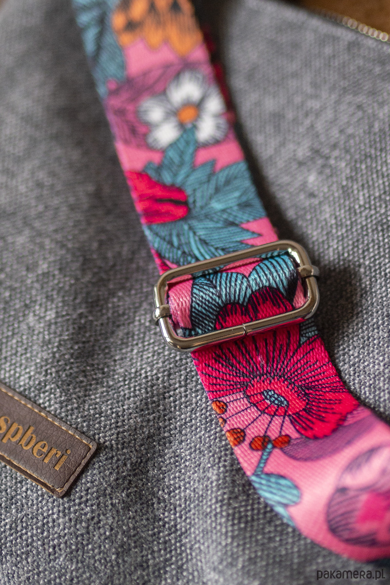 Torebka posiada regulowany, różowy pasek w kwiaty i srebrne okucia.