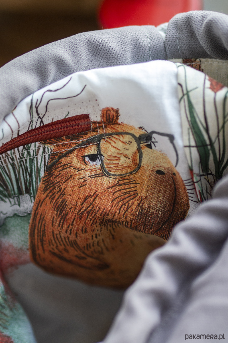 Wykonana z szarej tkaniny. Z przodu oraz z na tyle torebki kieszenie (np. na telefon czy chusteczki) w stylu patchworkowym. W środku kieszonka zapinana na suwak.
