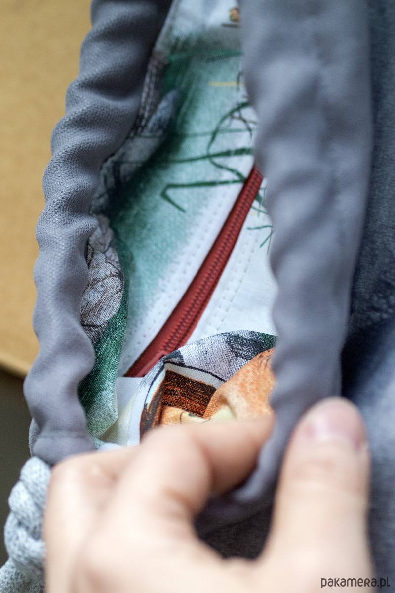 Całość ściągana grubym, bawełnianym sznurkiem w kolorze jasnoszarym.