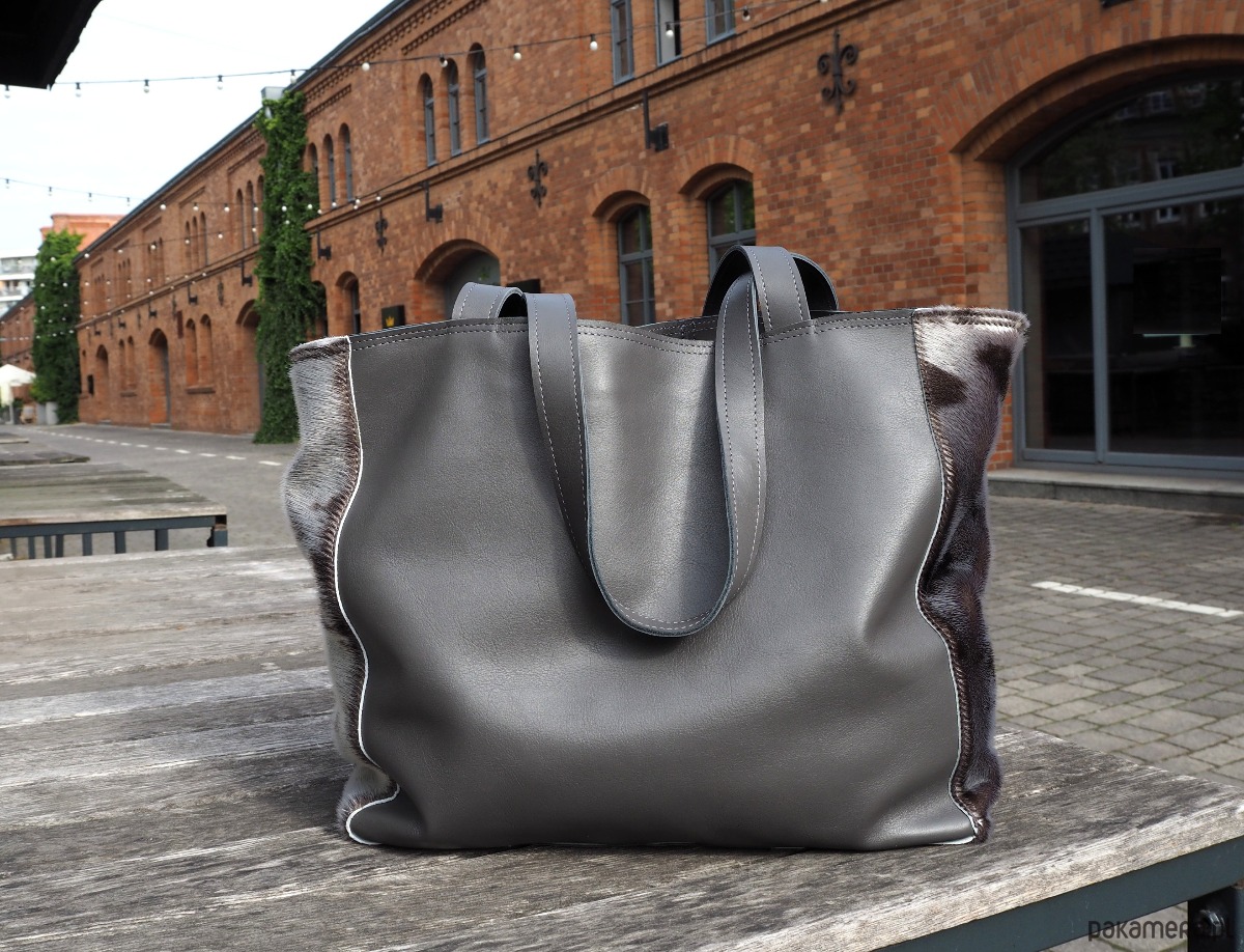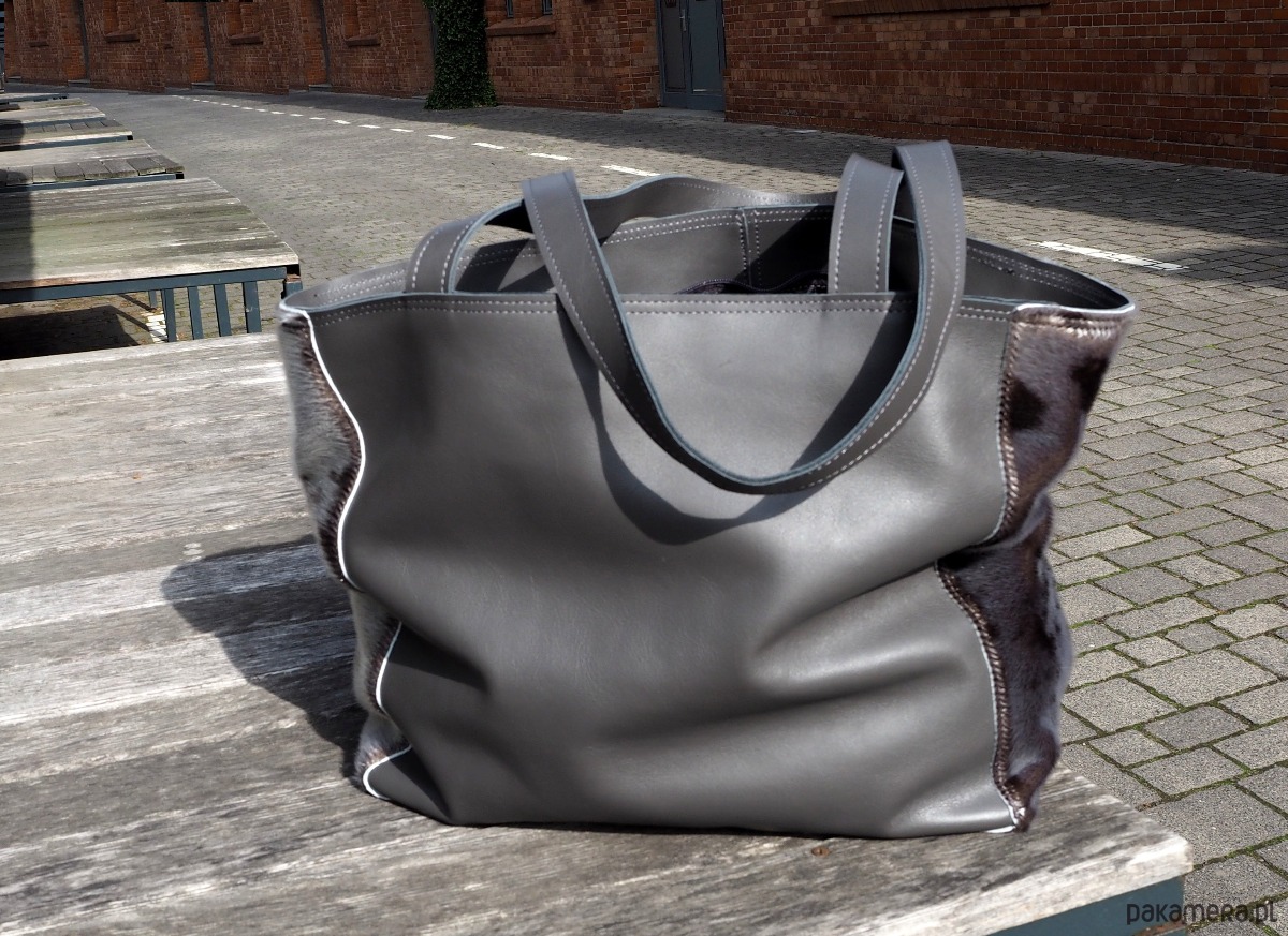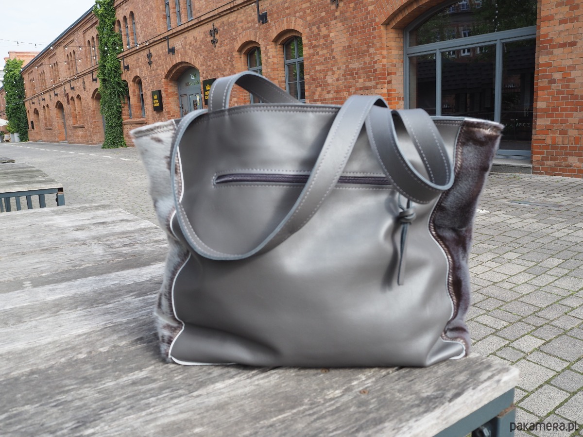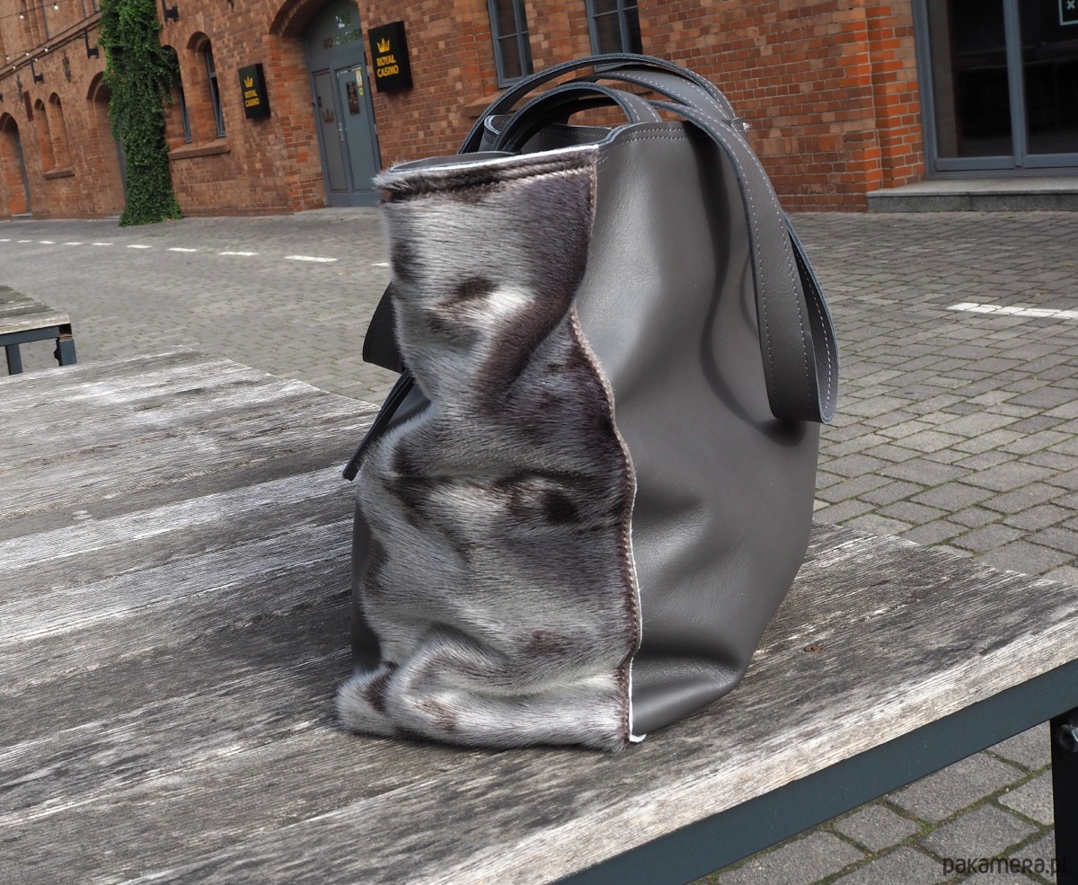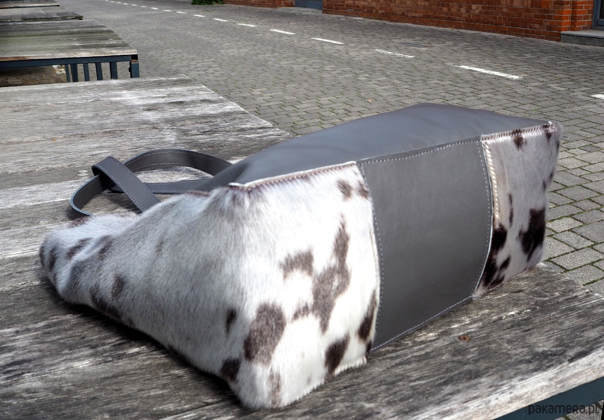 Uszyta z miękkiej szarej skóry naturalnej. Bok ze naturalnej skóry z włosem.