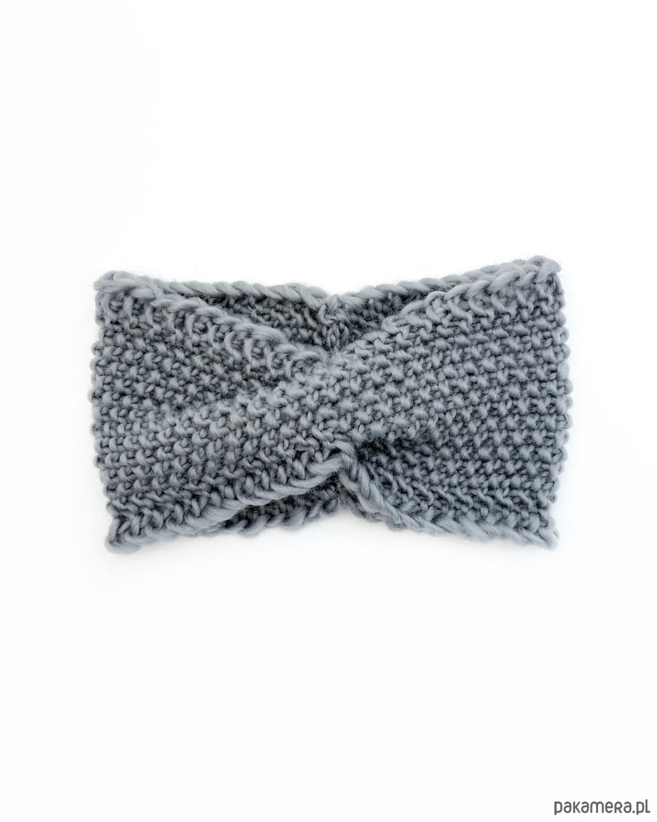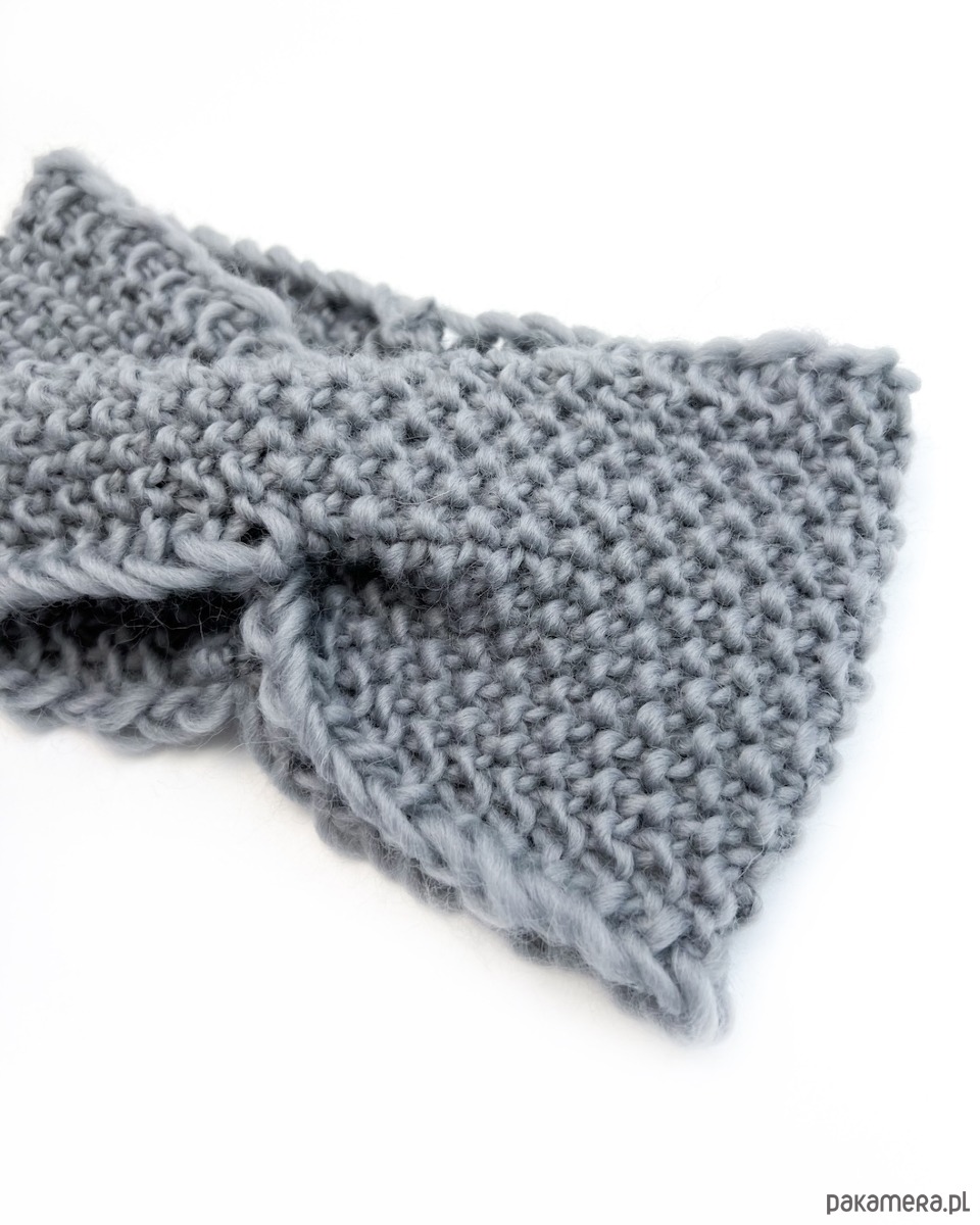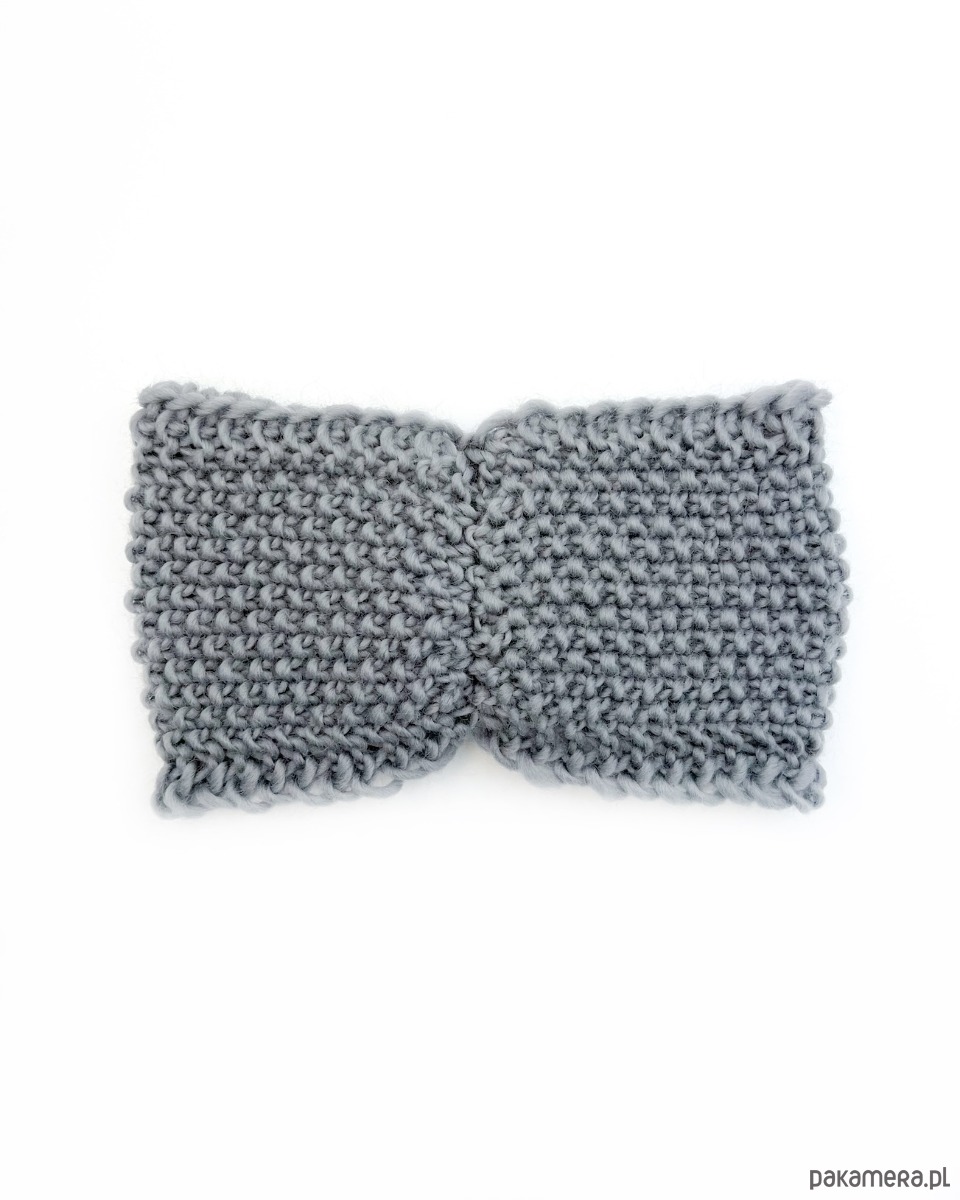 Szara wełniana opaska robiona na drutach ma kolor ciemnej oliwki. Jest miękka, wykonana z wełny peruwiańskiej owiec rasy Corriedale, czyli mieszanki z merynosem.