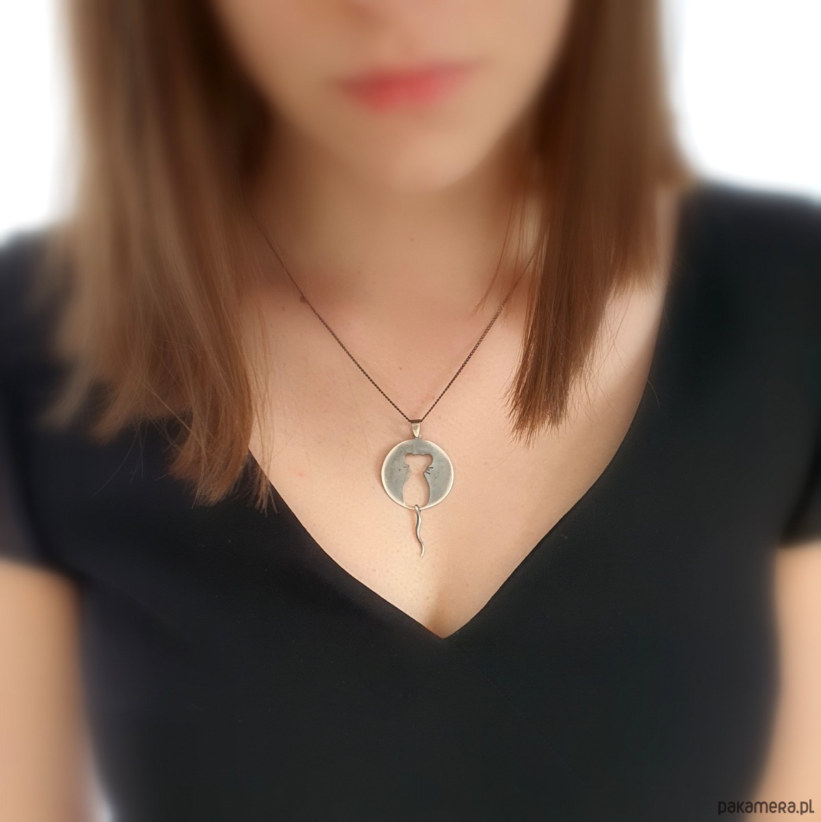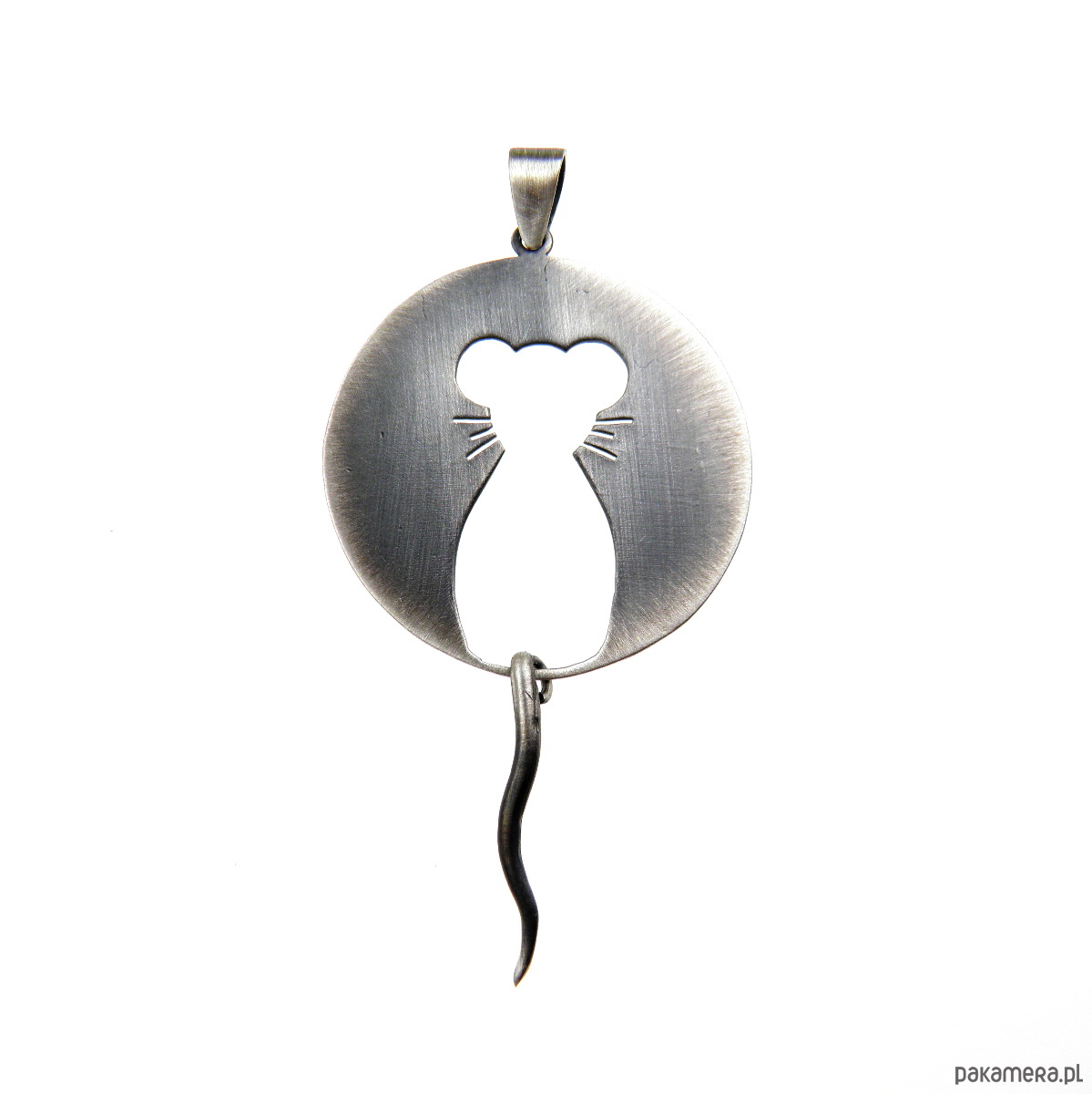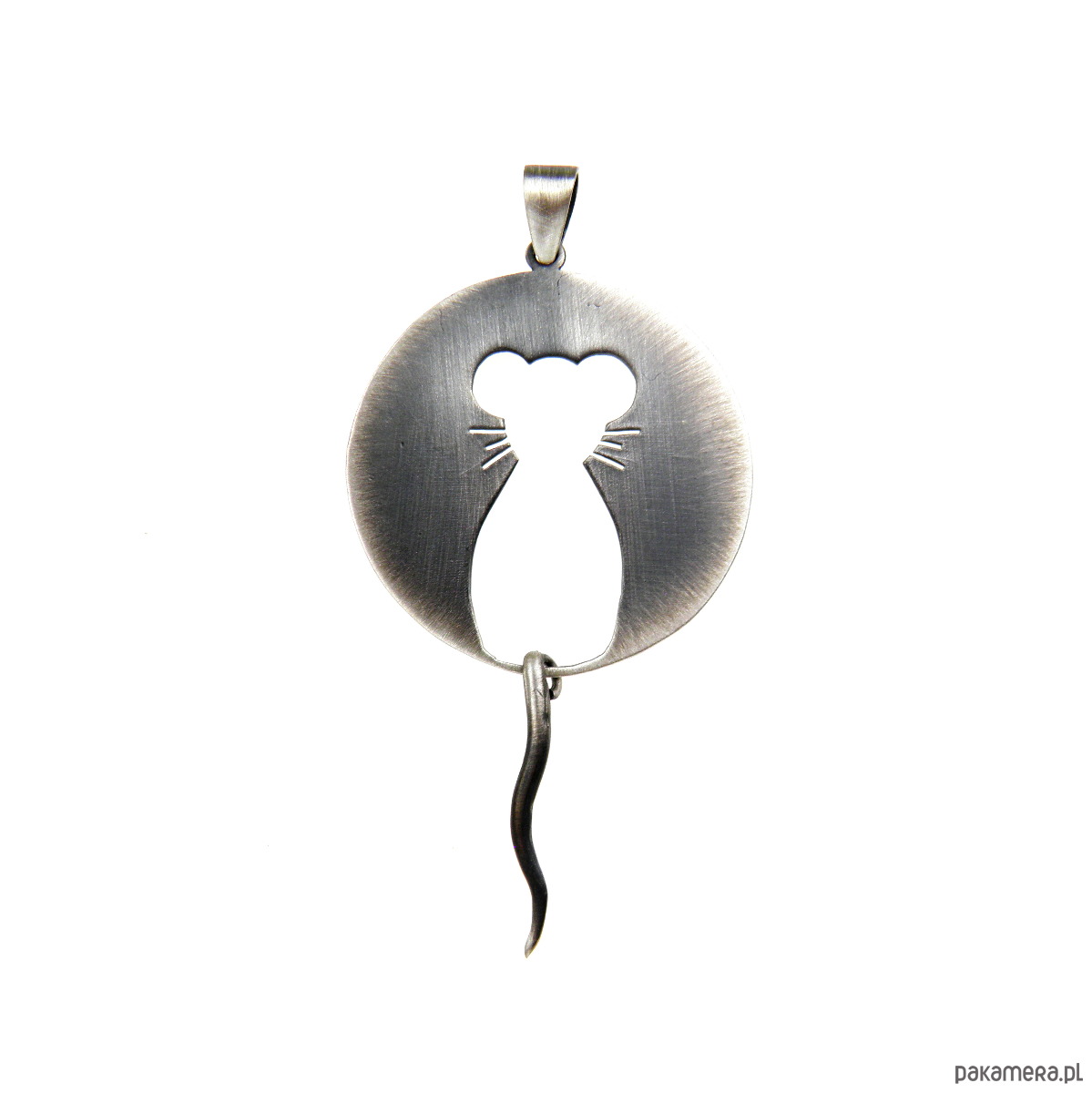 Zawieszka wykonana ze srebra próby 925, przedstawiająca wyciętą w kole sylwetkę myszki z dyndającym ogonkiem.