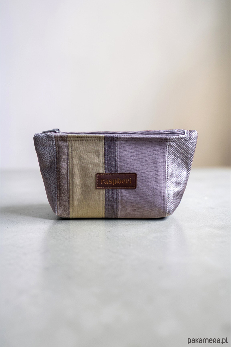 Średniej wielkości kosmetyczka wykonana kilku rodzajów tkanin. Stworzona w duchu no waste.
