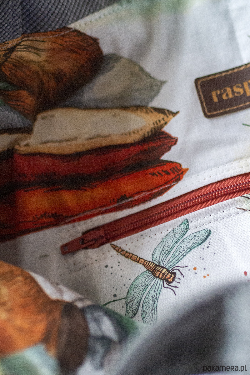 Torebka posiada bawełnianą podszewkę w kapibary, a w środku kieszeń zapinaną na suwak. Z tyłu torby znajduje się dodatkowa kieszonka zapinana na suwak.