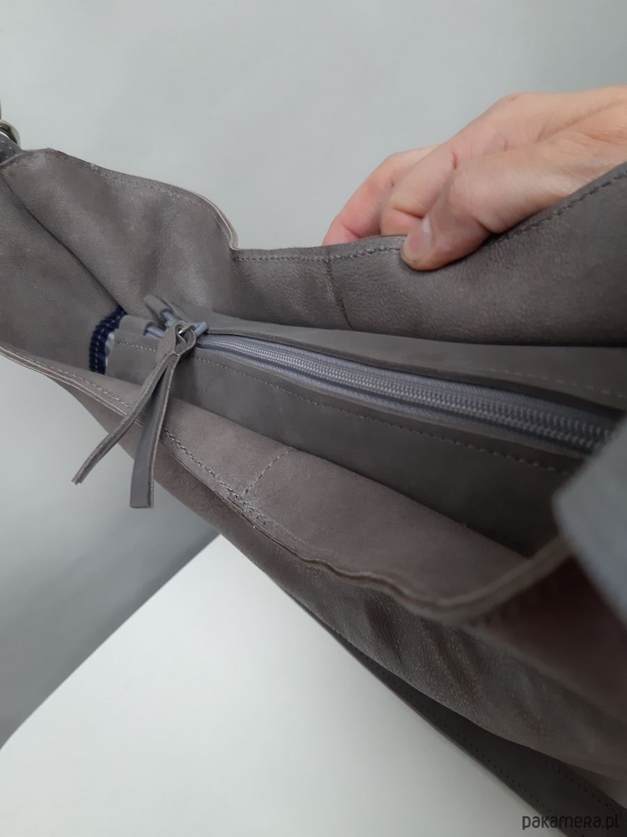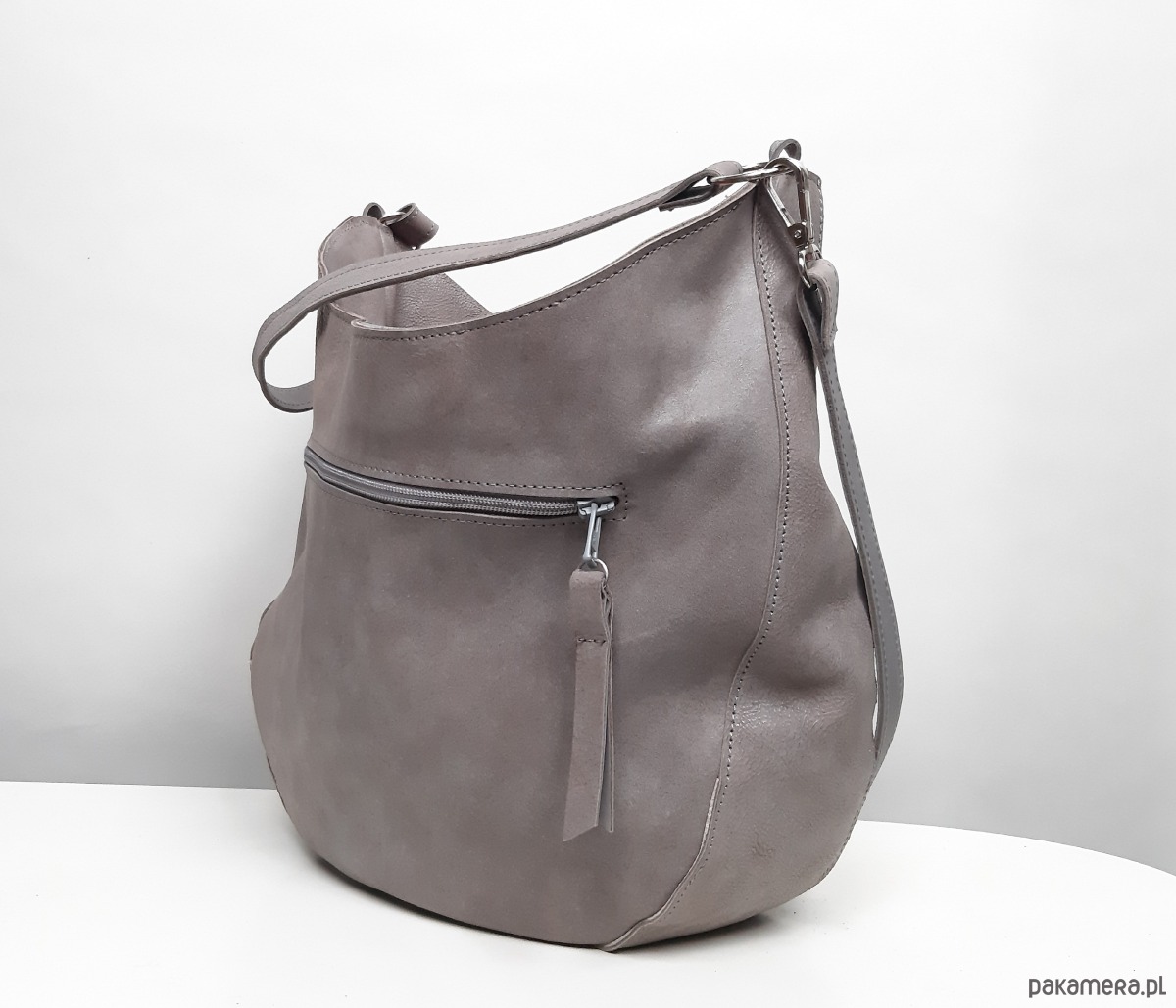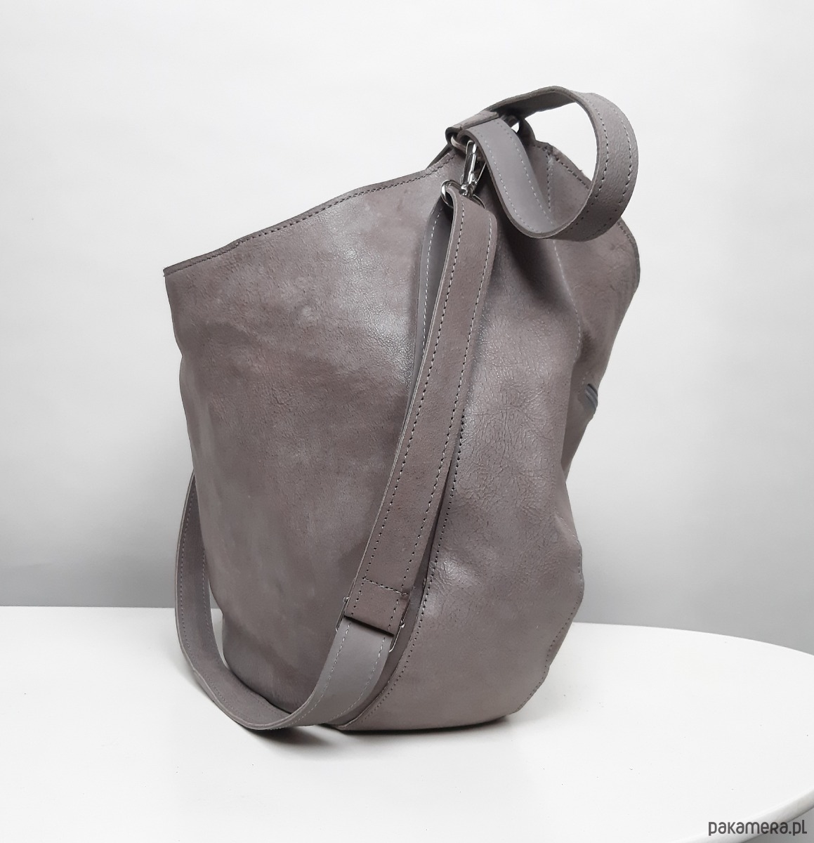 Uszyta z miękkiej ale grubszej szarej w odcieniu skóry słonia skóry naturalnej. Skóra ma piękną fakturę, przez którą przebija kolor beżowy. Tak więc można torbę nosić i do rzeczy szarych i do beżowych.