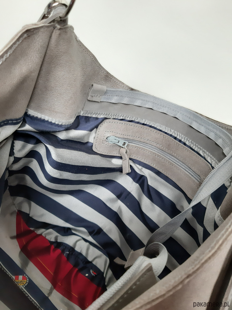Z tyłu ma zewnetrzną kieszonkę zapinaną na zamek.