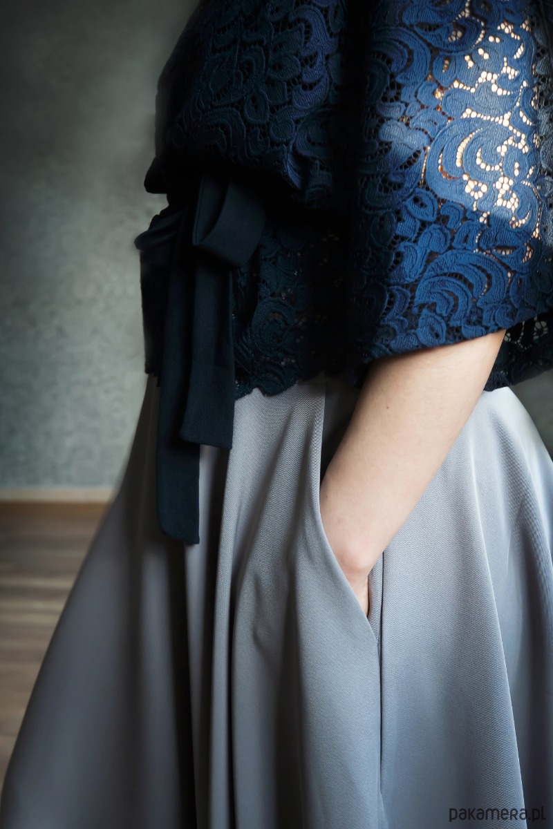 Spódnica wykonana ze średnio cienkiej tkaniny z poliestru. Fason z koła, jest rozłożysta, przy kręceniu się ładnie układa się na boki. Tył i przód tej samej długosci,około 101 cm dla rozmiaru M. Posiada kieszonki po bokach oraz zamek kryty. Dodatkowo w pas wszyte szlufki, dołączony jest pasek z tego samego materiału.