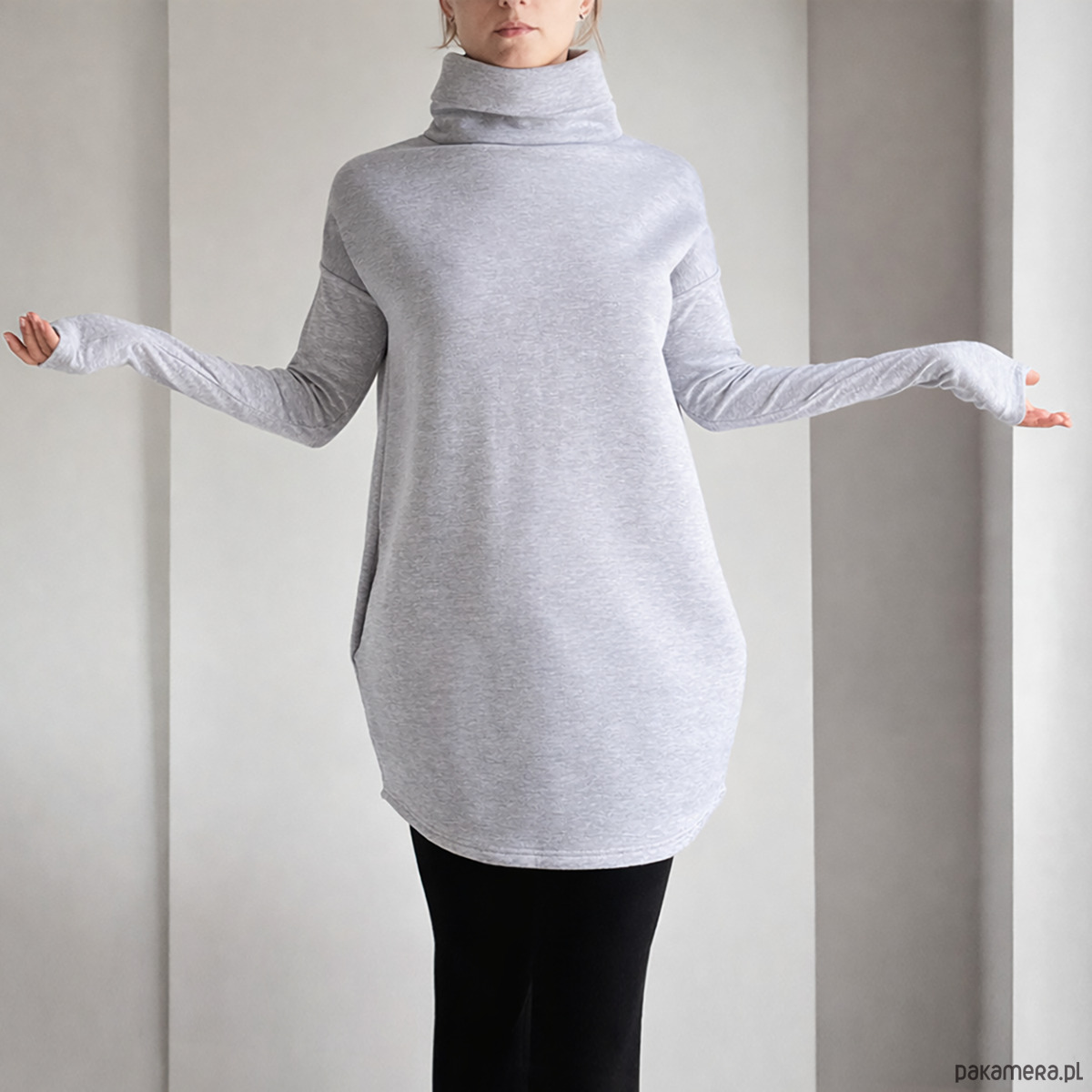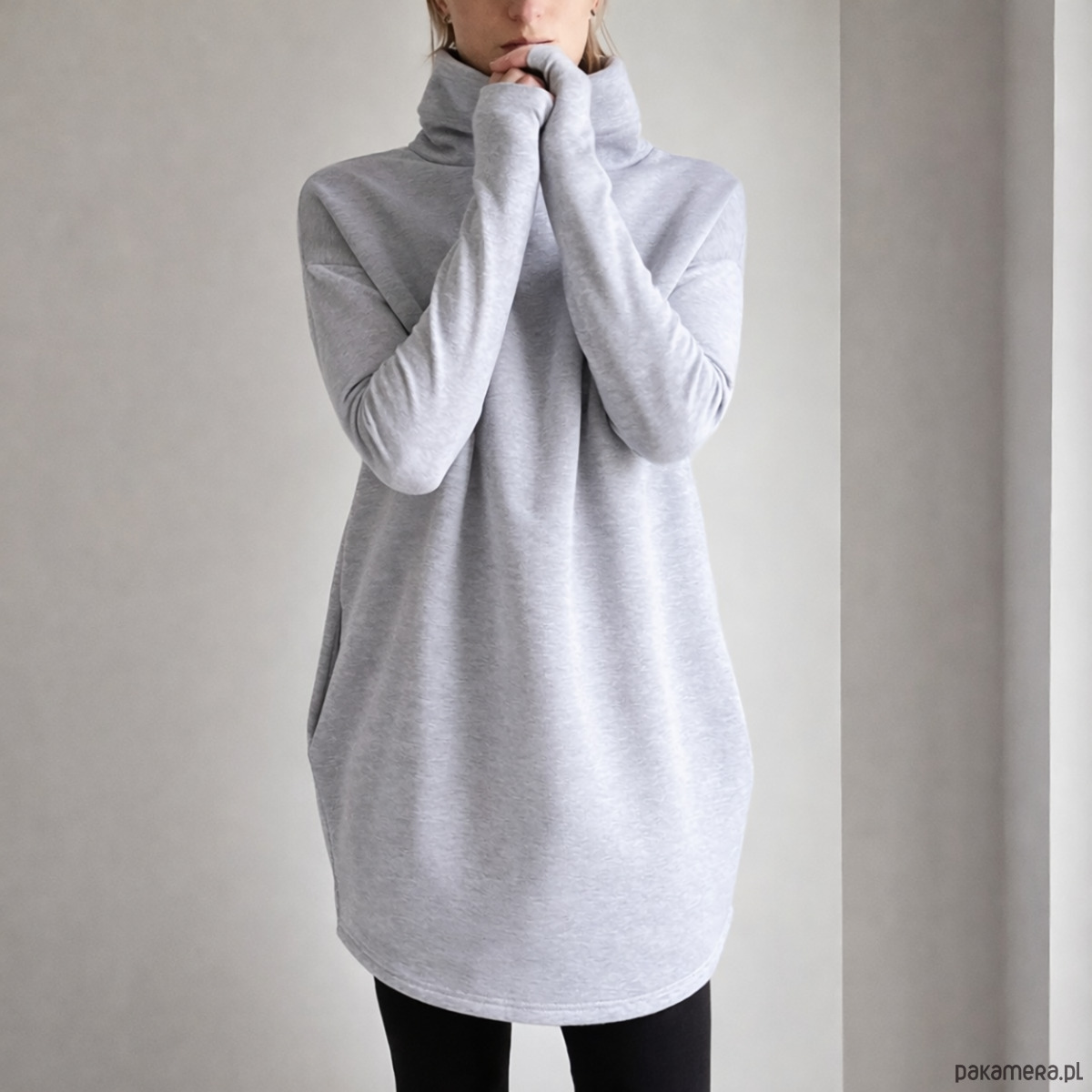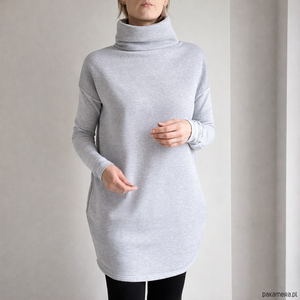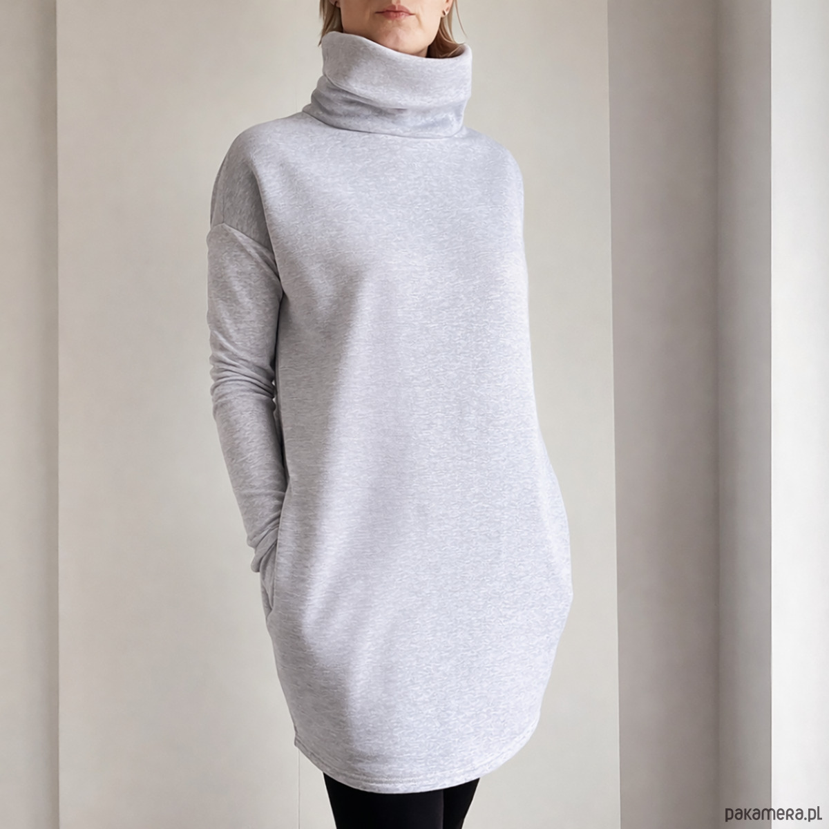 Ciepła, miękka sukienka z grubej dresówki w szarym melanżu, z wysokim golfem, w którym serio można się zakochać.