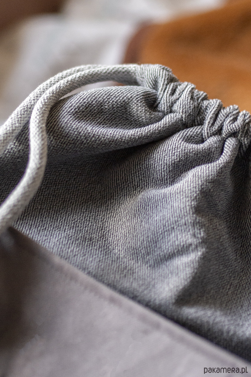Torba na ramię z kominem, ściągana jak worek, w kolorze szarym. Z przodu i z tyłu torebki duże otwarte kieszenie.