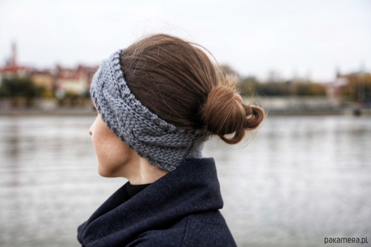 Szara wełniana opaska warkoczowa na wiosnę