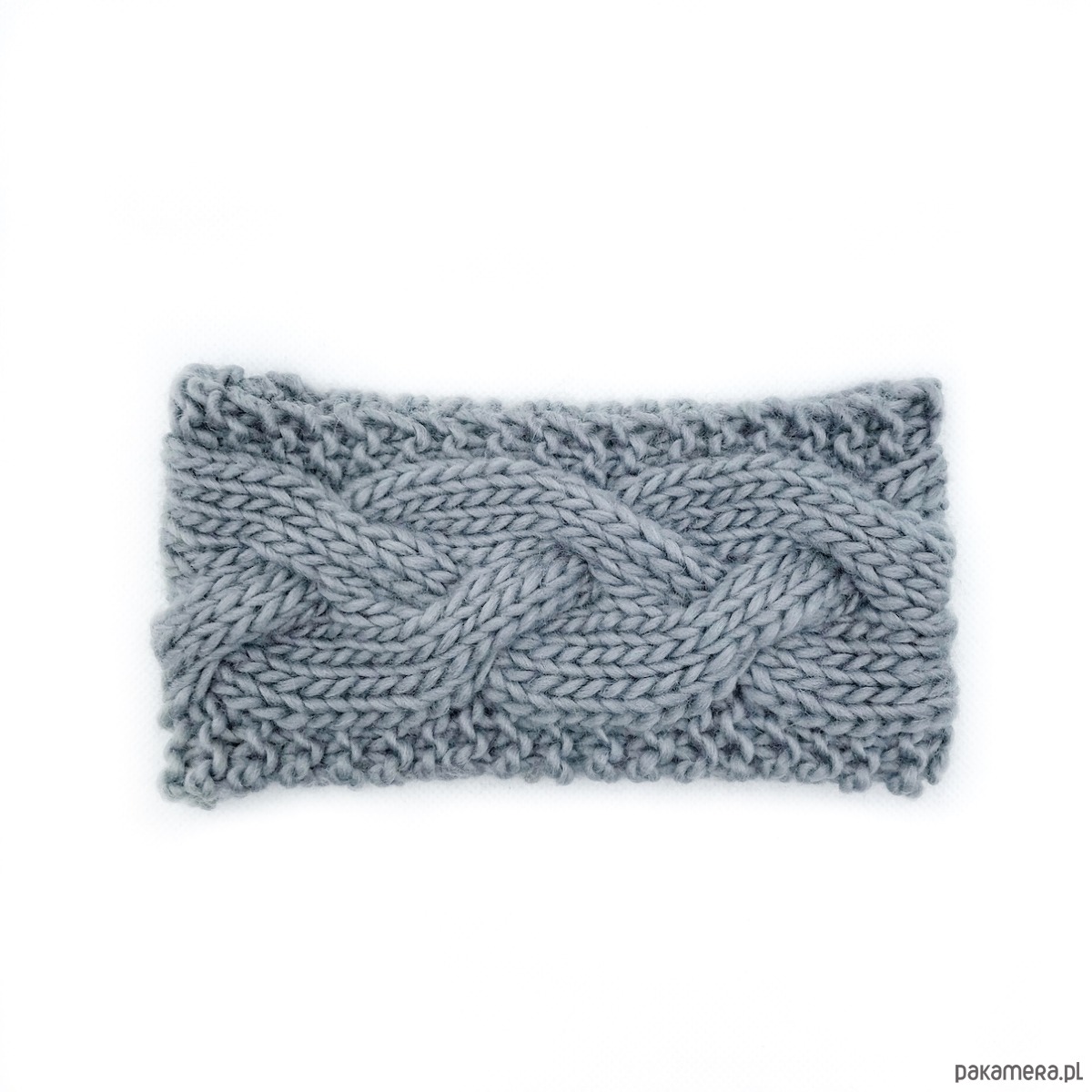 Szara wełniana opaska warkoczowa to produkt wykonany na drutach z miękkiej, 100% wełny peruwiańskiej w kolorze stalowej szarości.