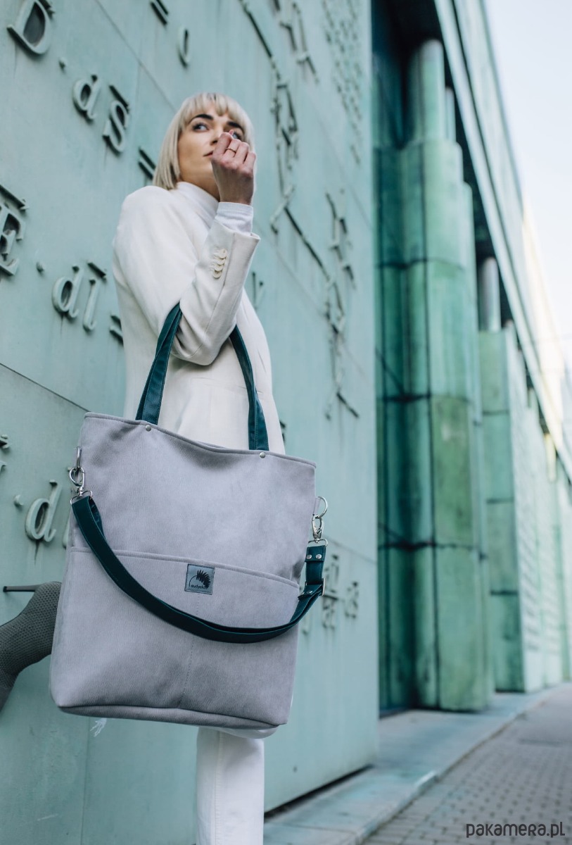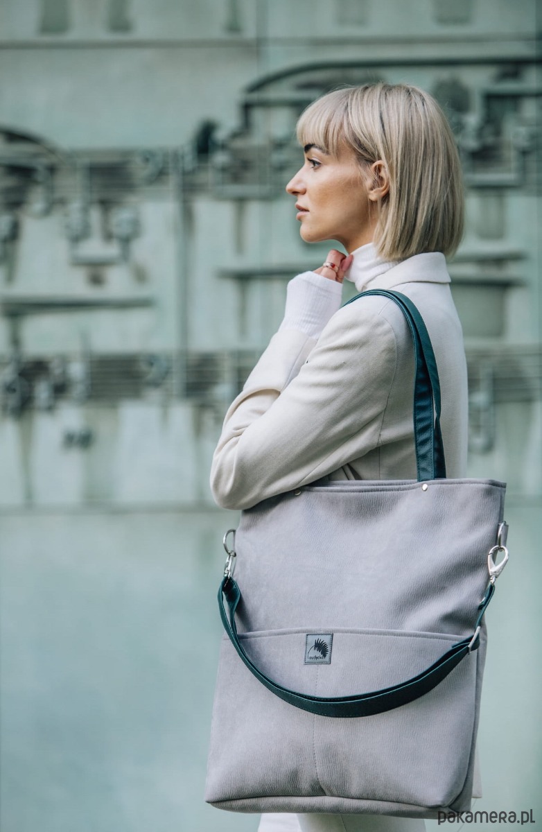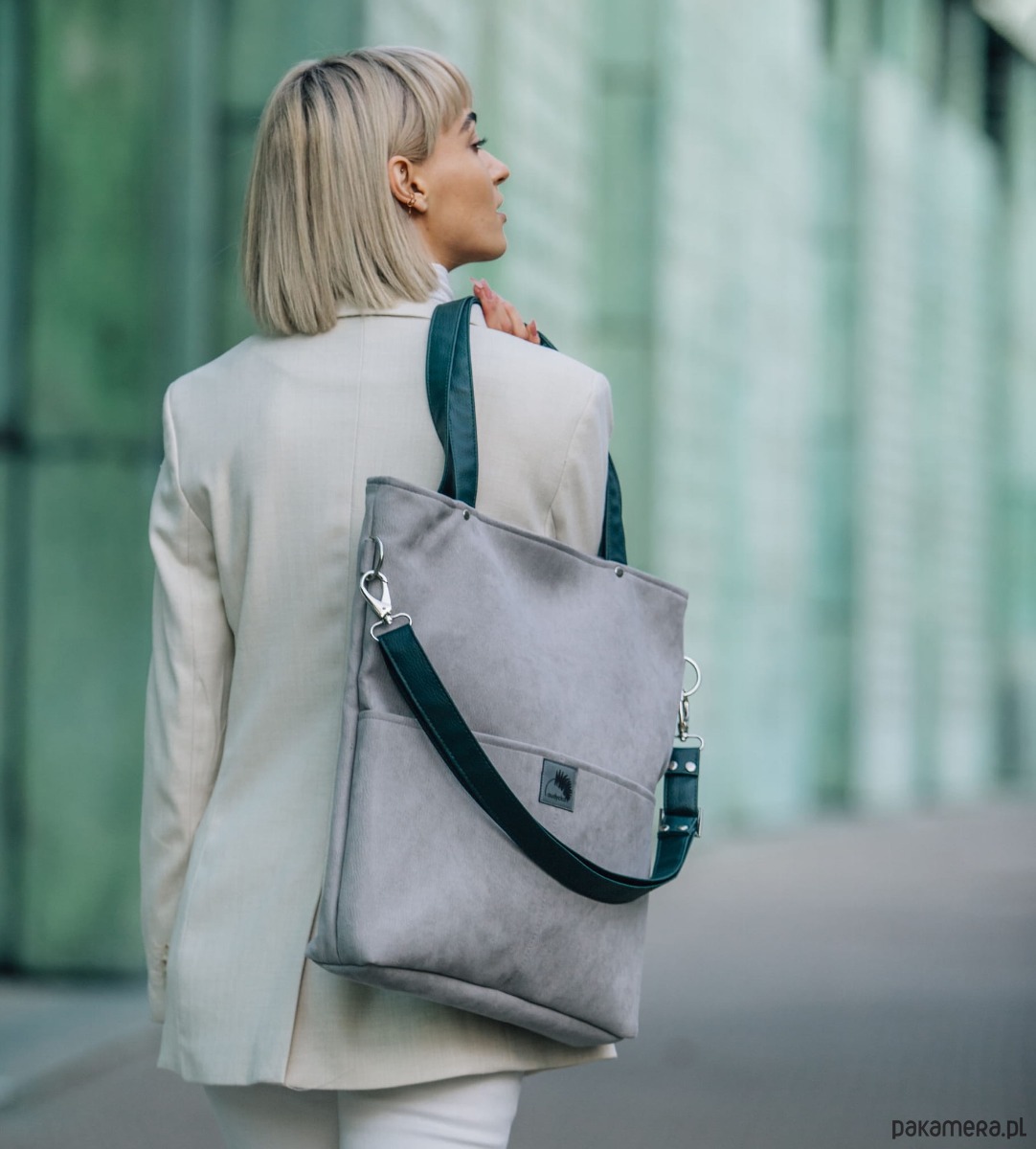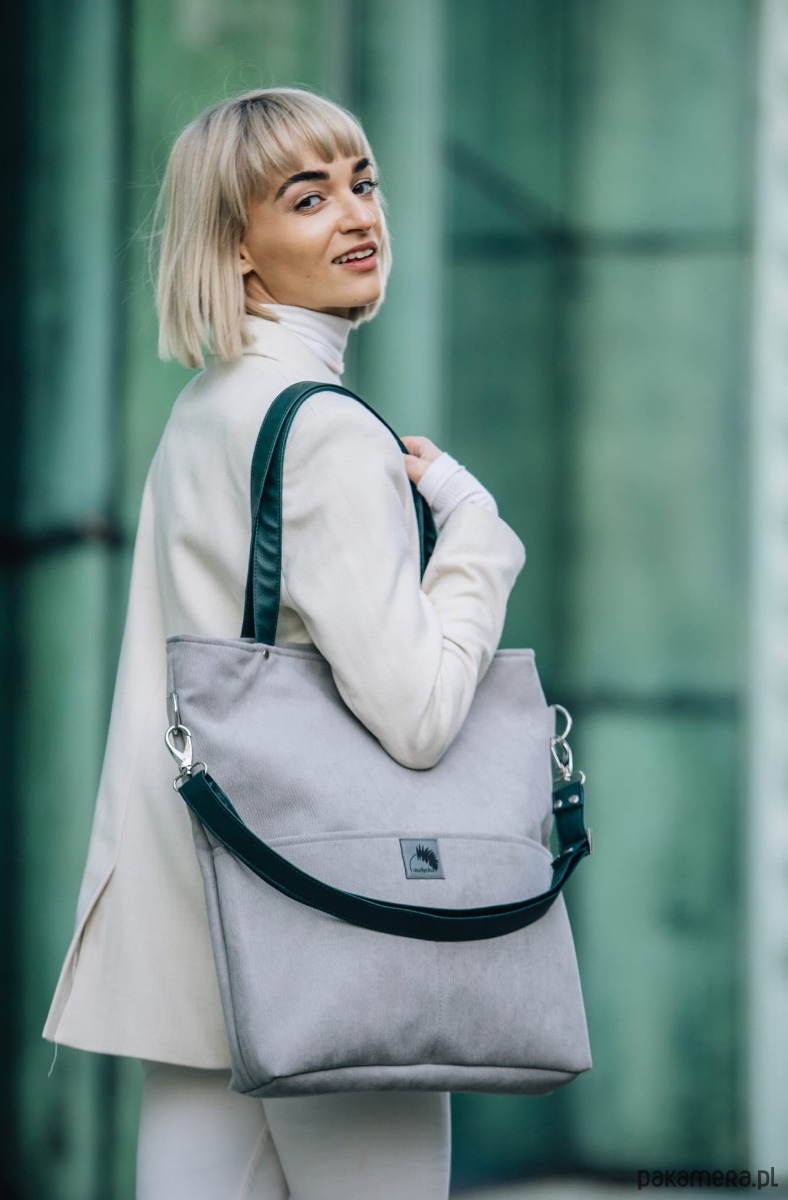 Duża szara zamszowa torba (sztywny, gruby, wodoodporny nubuk ekologiczny ) do noszenia na ramieniu i na skos. Paski kolor butelkowa zieleń.