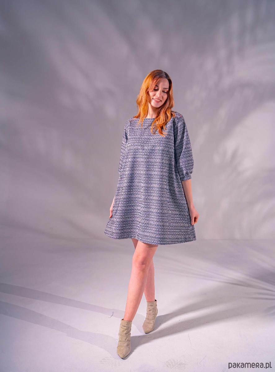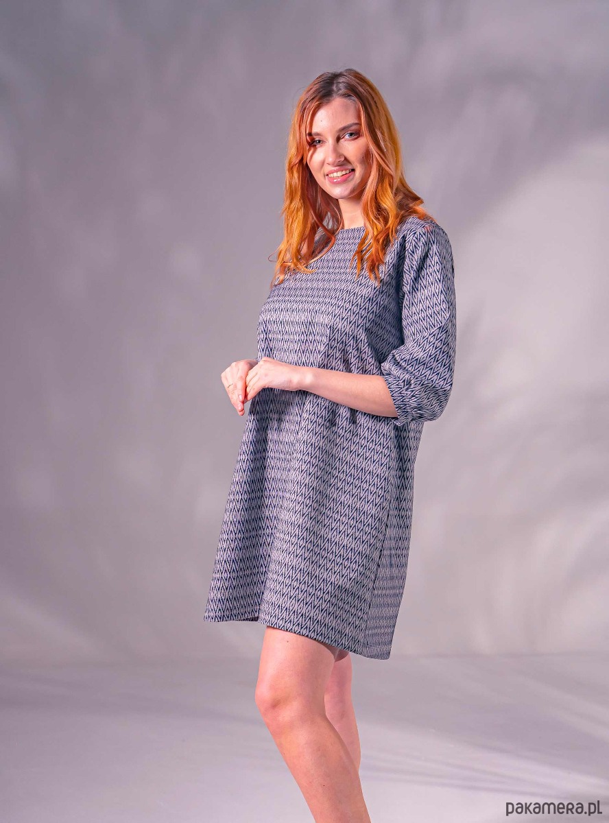 Szara sukienka z marszczonym rękawem. Fason litera A, po bokach kieszonki. Sukienka jest rozciągliwa, więc pozwala na lepsze dopasowanie. Posiada szlufki z paskiem, jest wiązana i można nosić na dwa sposoby. Rękaw prosty, marszczony na dole w delikatny mankiecik. Długość przed kolano. Na wyższej osobie może być krótsza.