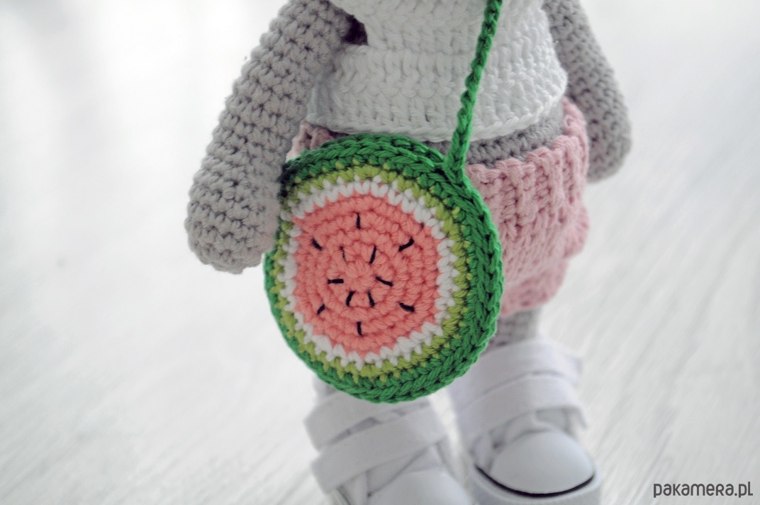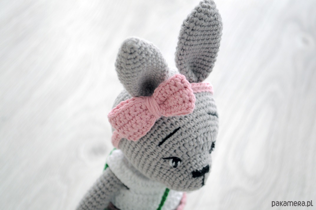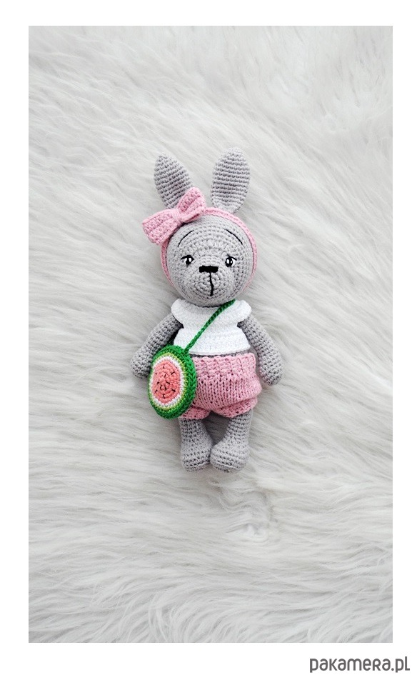 Skład: zając i ubranka (opaska, bluzka, spodnie,torebka): bawełna, puch antyalergiczny