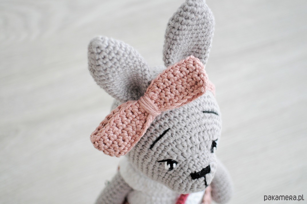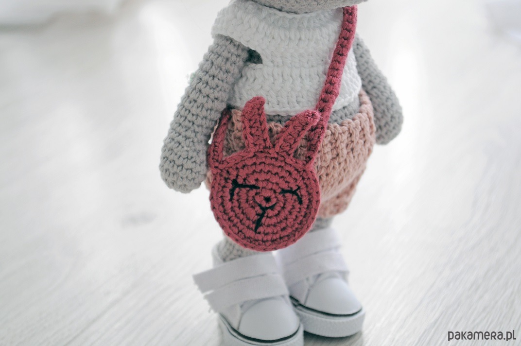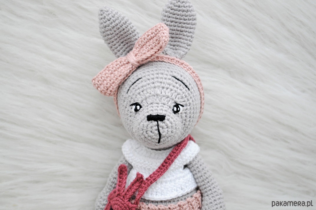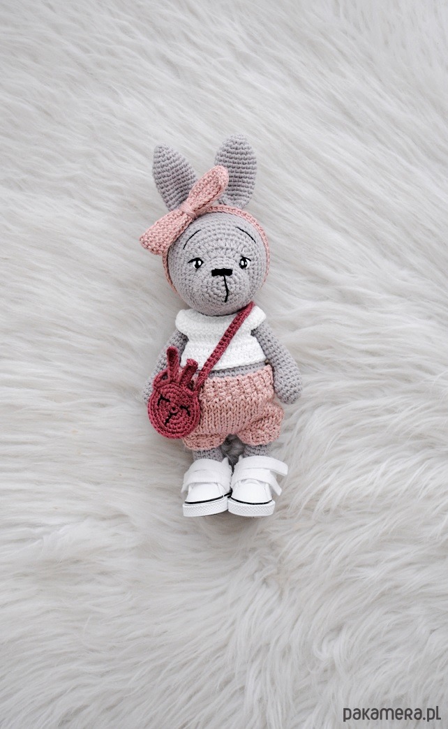 Skład: zając i ubranka (opaska, bluzka, spodnie,torebka): bawełna, puch antyalergiczny