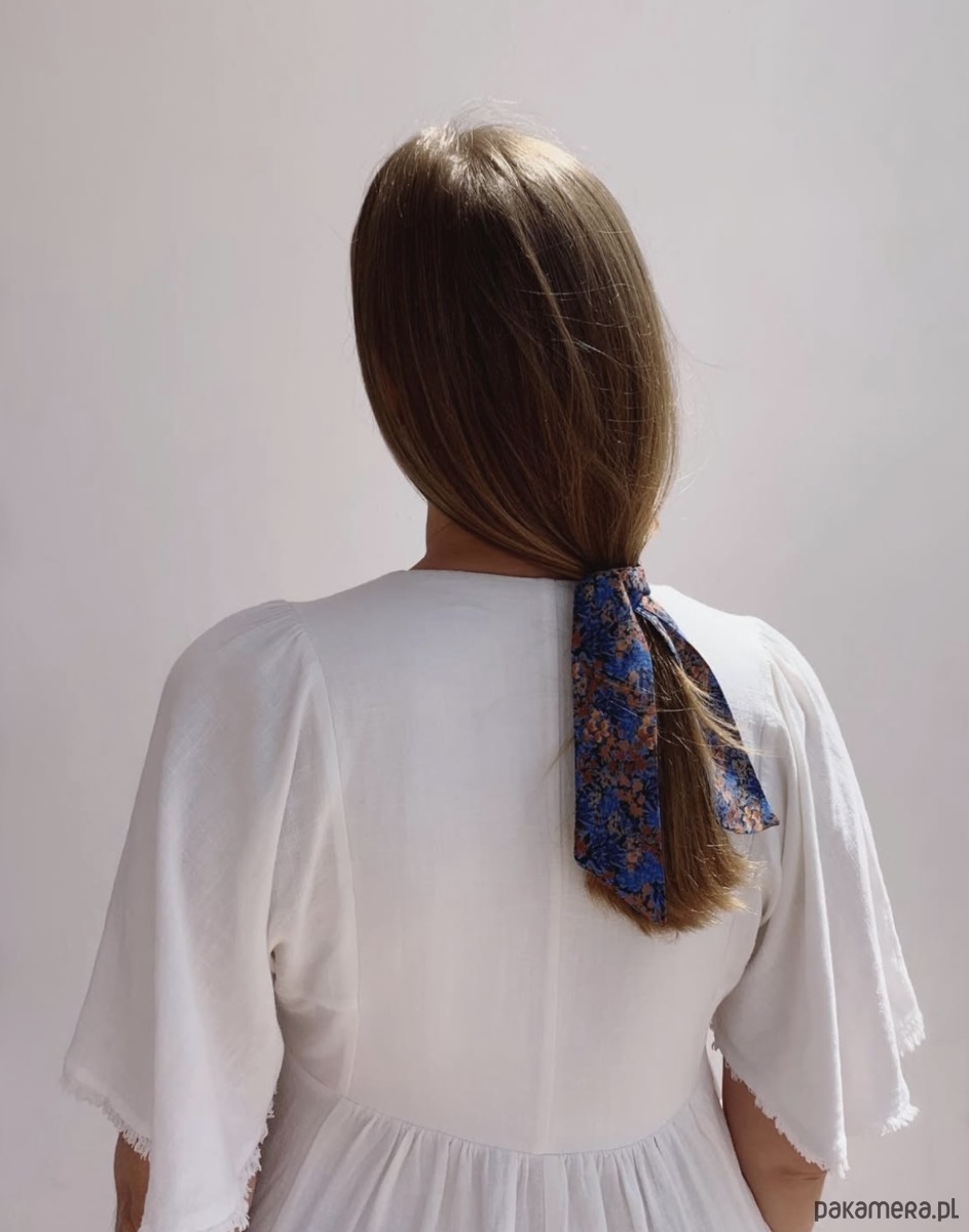 Szarfę możesz zawiązać na włosach, przewiązać przez szlufki spodni, dowiązać do scrunchie, którą już masz w swojej kolekcji lub wykorzystać jako ozdobę torebki.