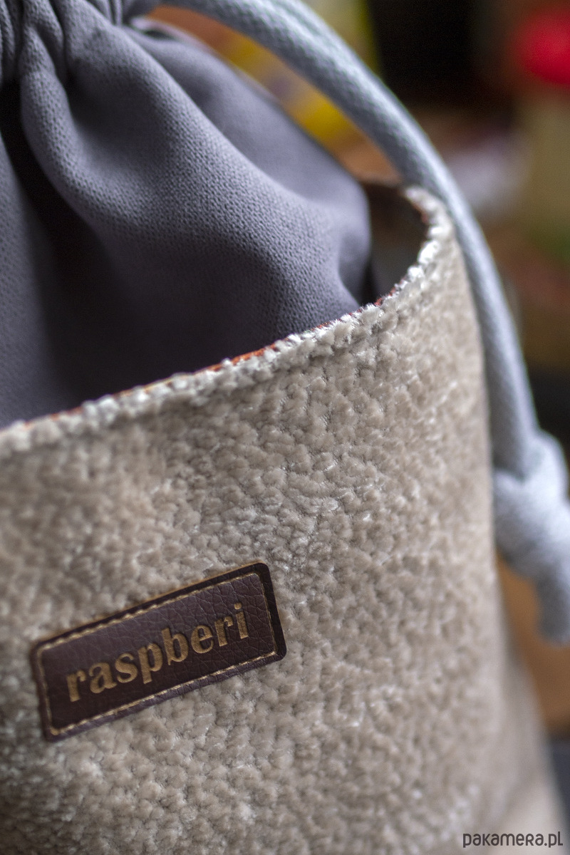 Wykonana z szarej tkaniny. Z przodu oraz z na tyle torebki kieszenie (np. na telefon czy chusteczki) z kremowego, lekko połyskującego "baranka". W środku kieszonka zapinana na suwak.