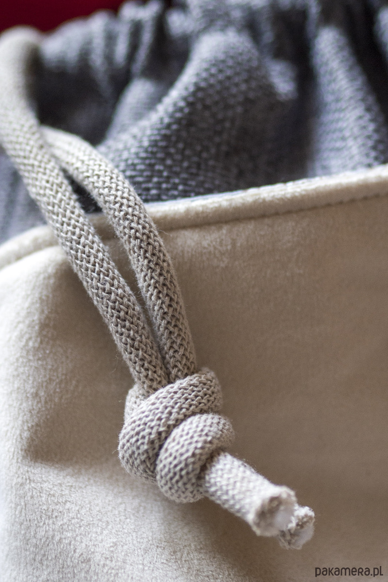 Całość ściągana grubym, bawełnianym sznurkiem w kolorze beżowym.