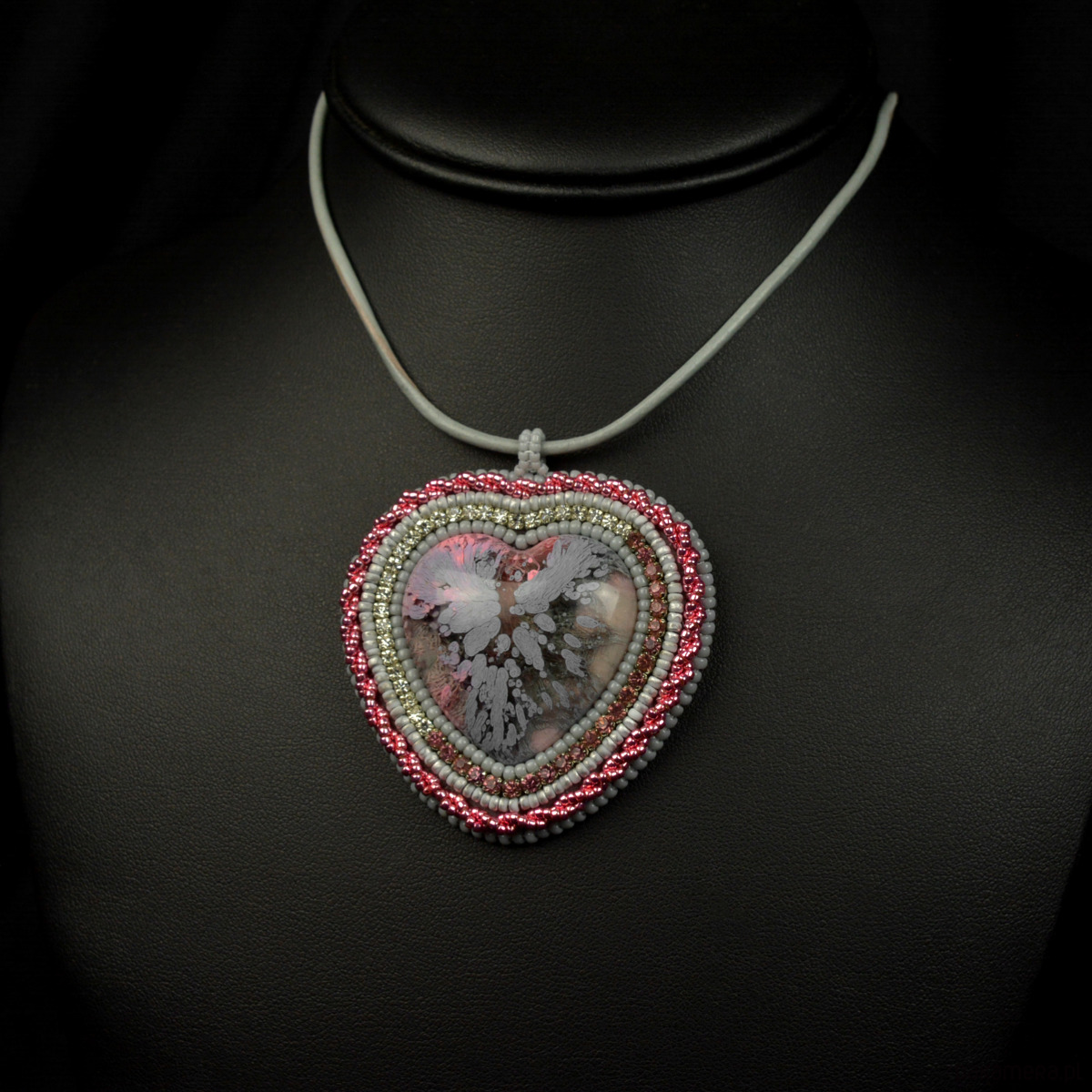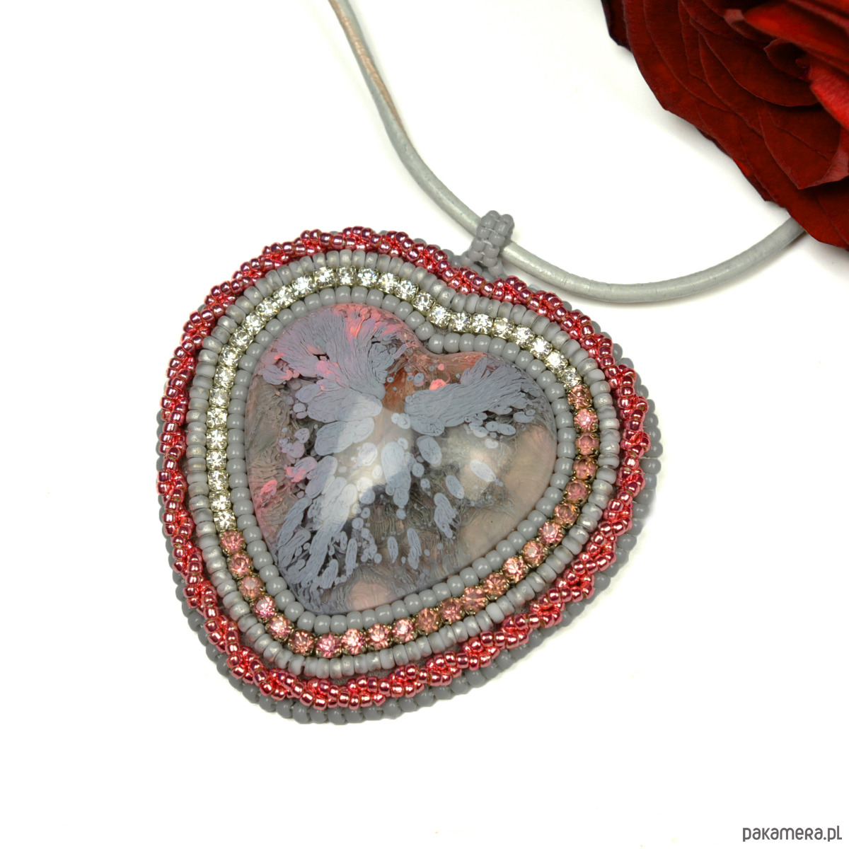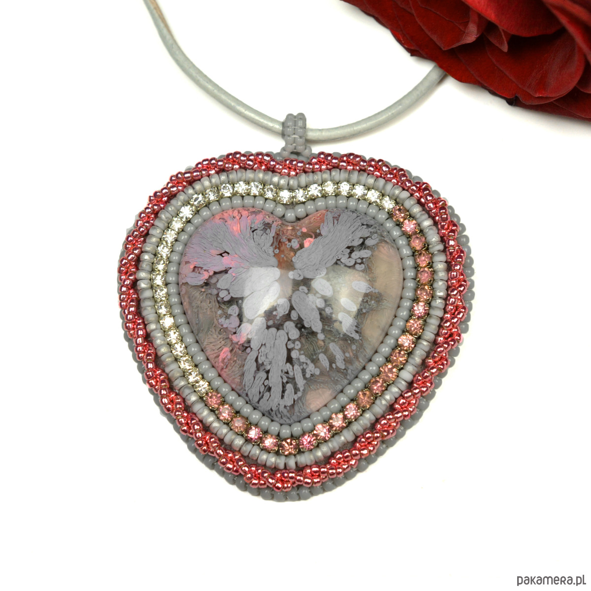 Szaroróżowe serce, wisior z żywicą, haft koralikowy