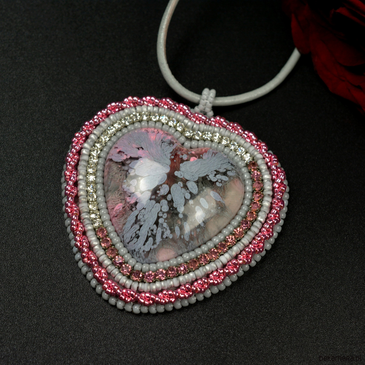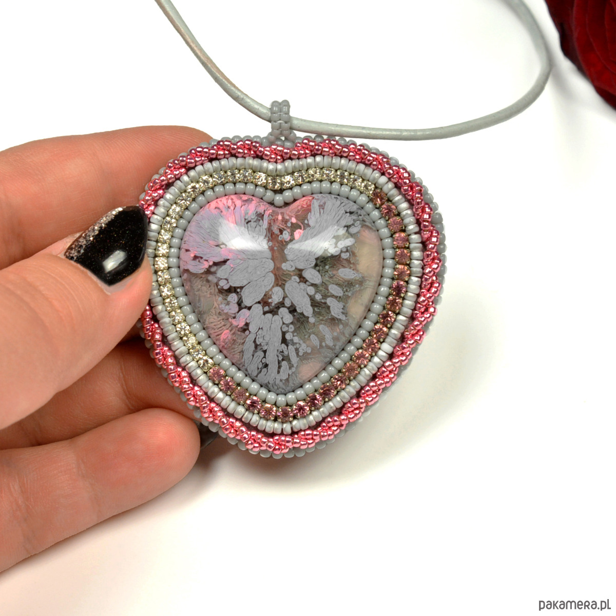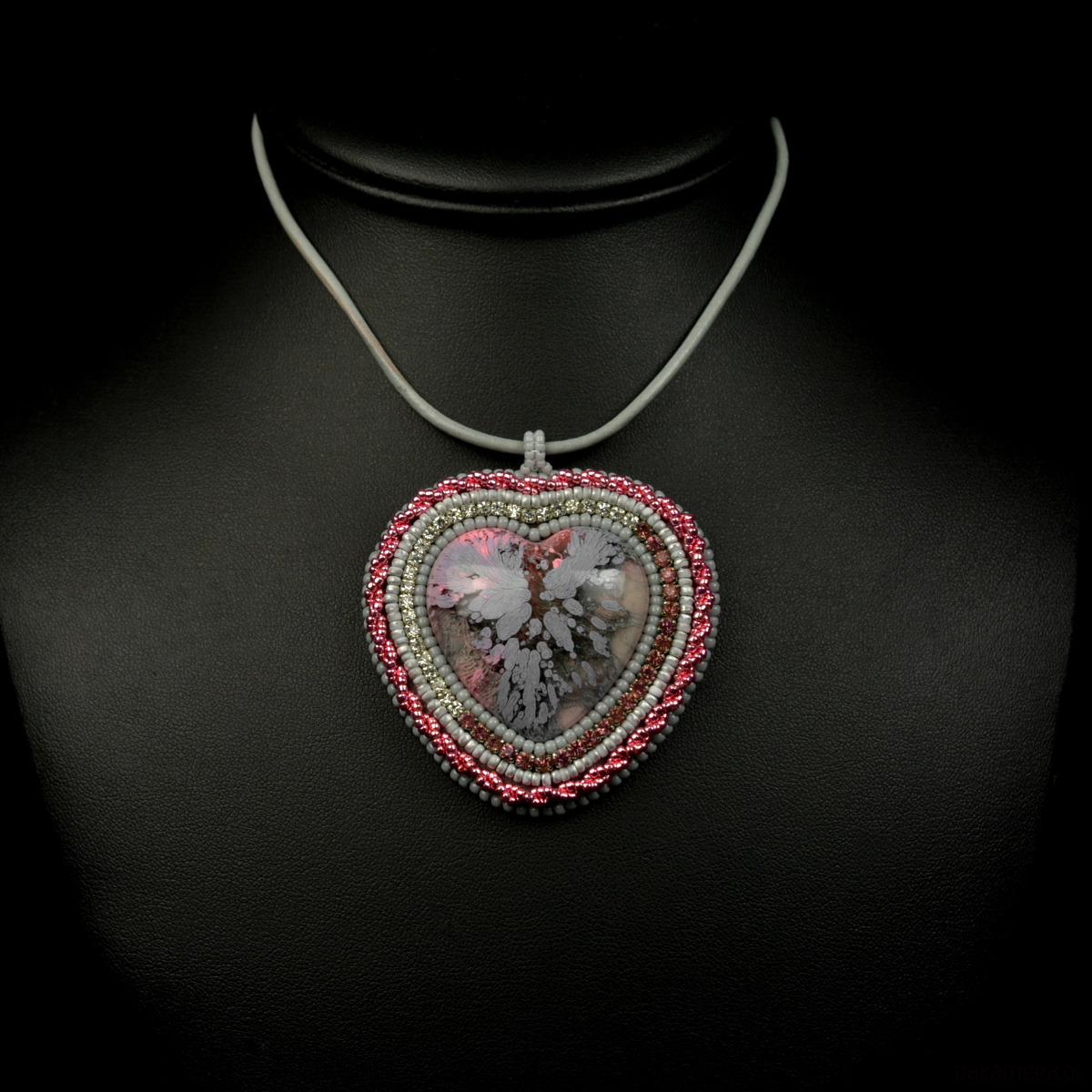 Szaroróżowe serce, wisior z żywicą, haft koralikowy