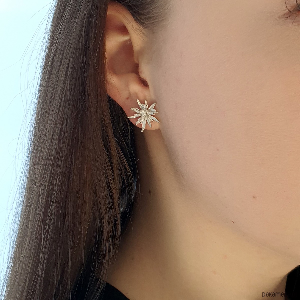 Subtelne kolczyki srebrne przedstawiające kwiat szarotki górskiej.