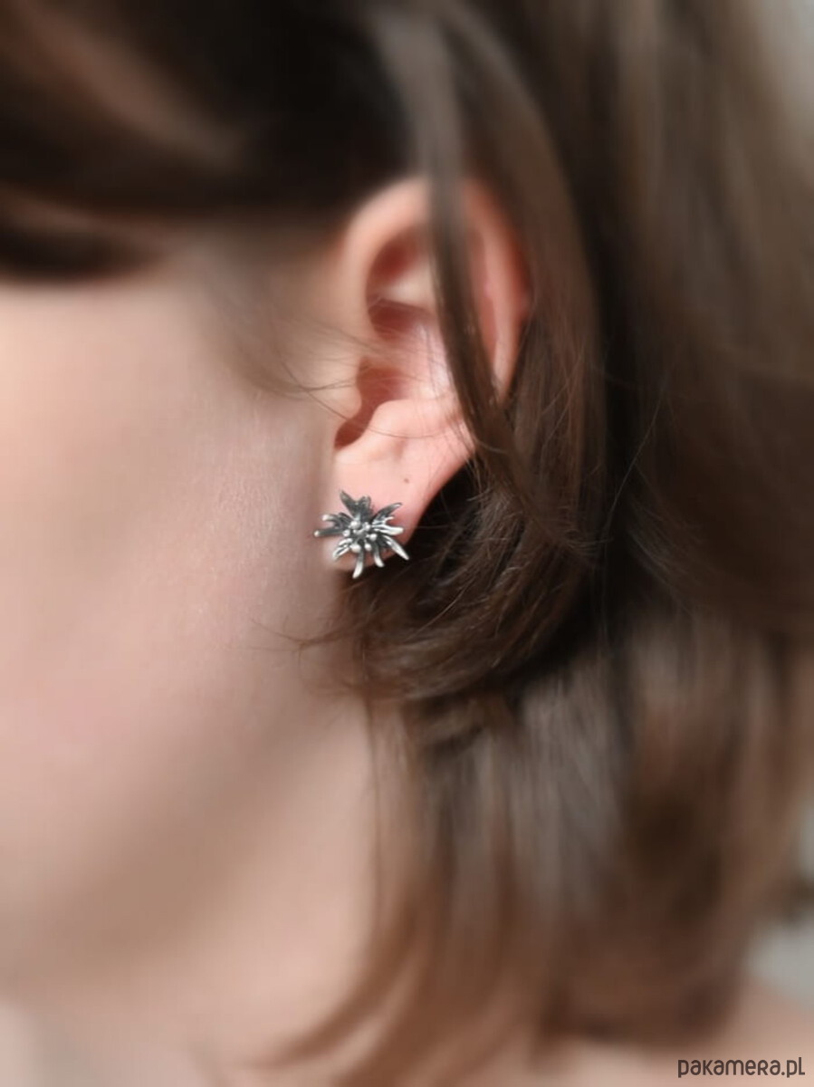 Te wyjątkowe kolczyki przedstawiają górski kwiat szarotkę, stanowiąc piękną ozdobę na uszach.