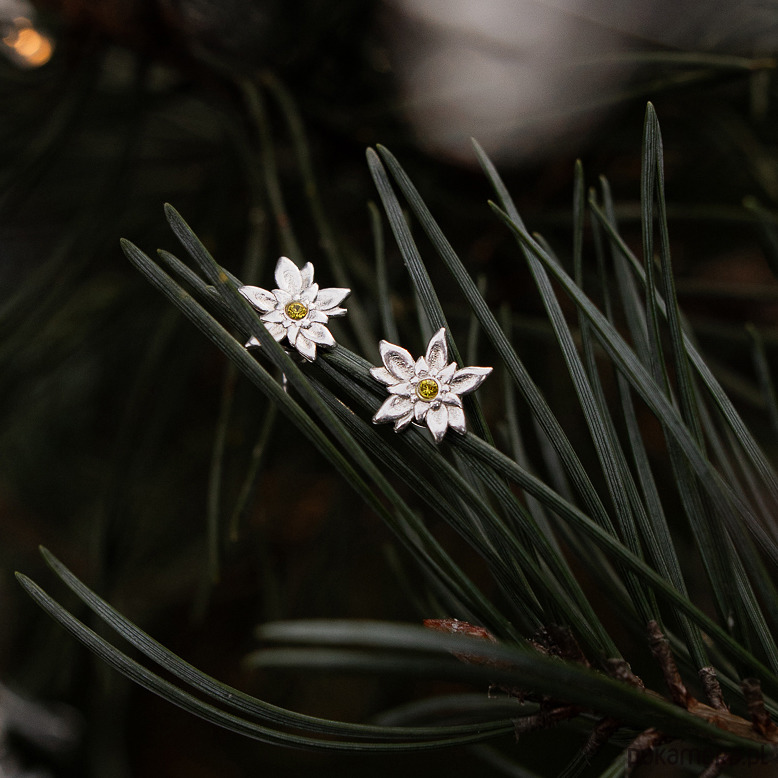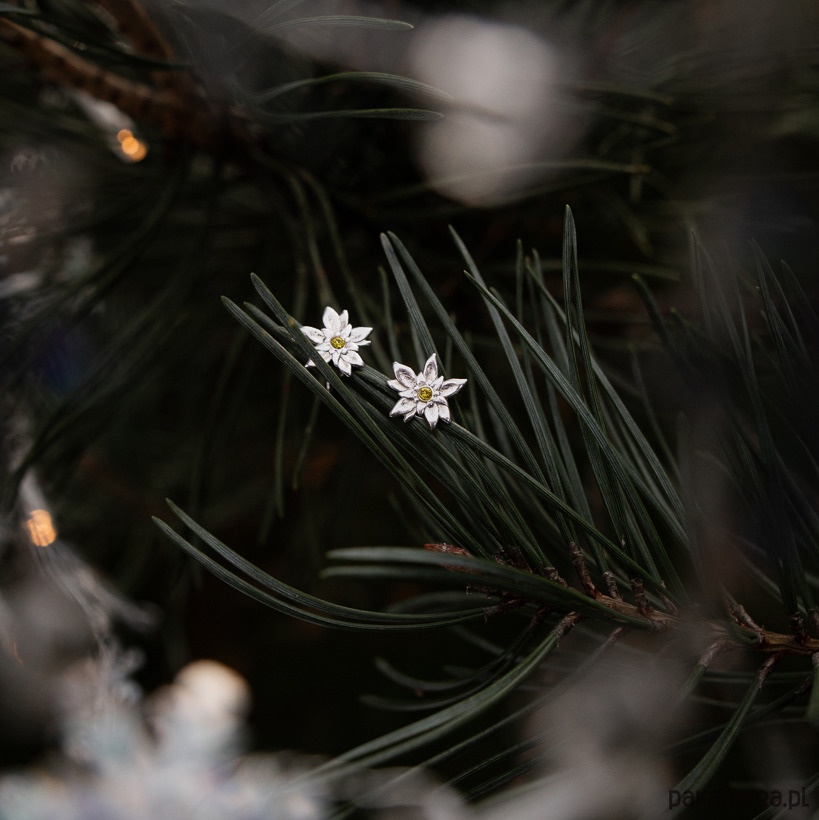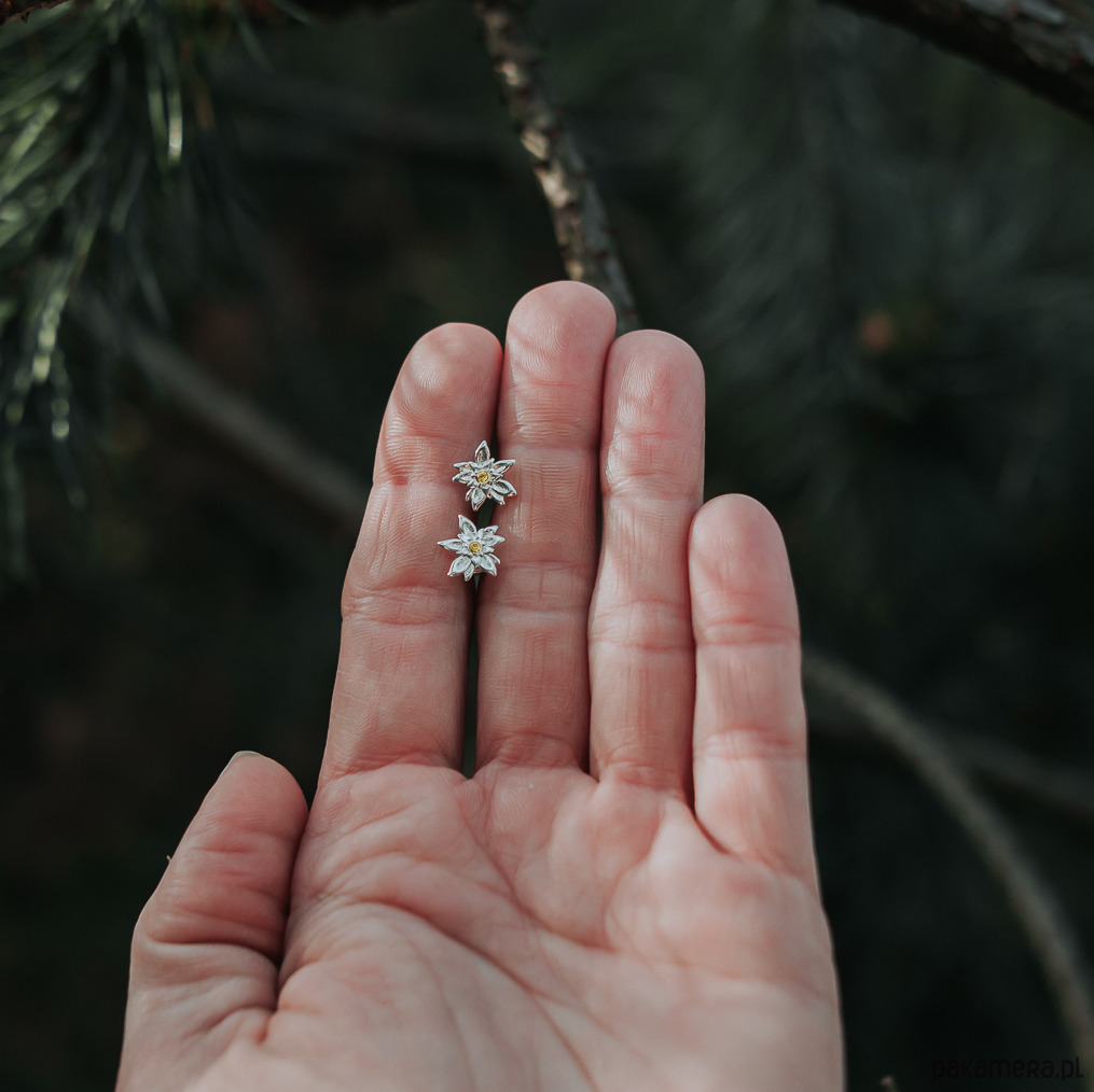 Drobne kolczyki przedstawiające kwiat górskiej szarotki.
