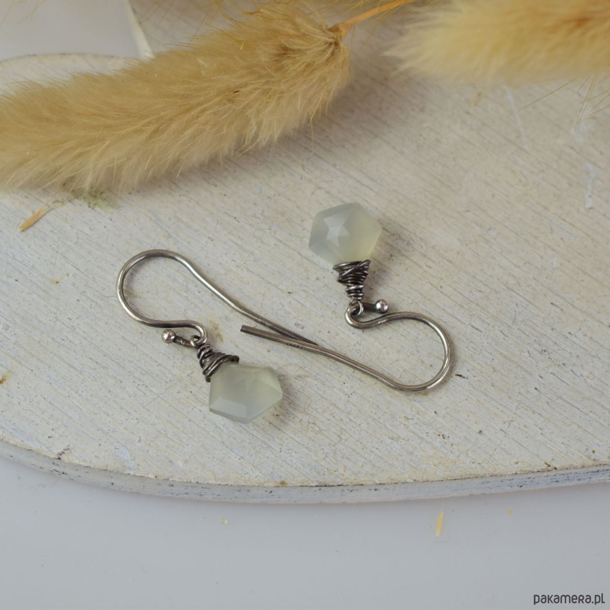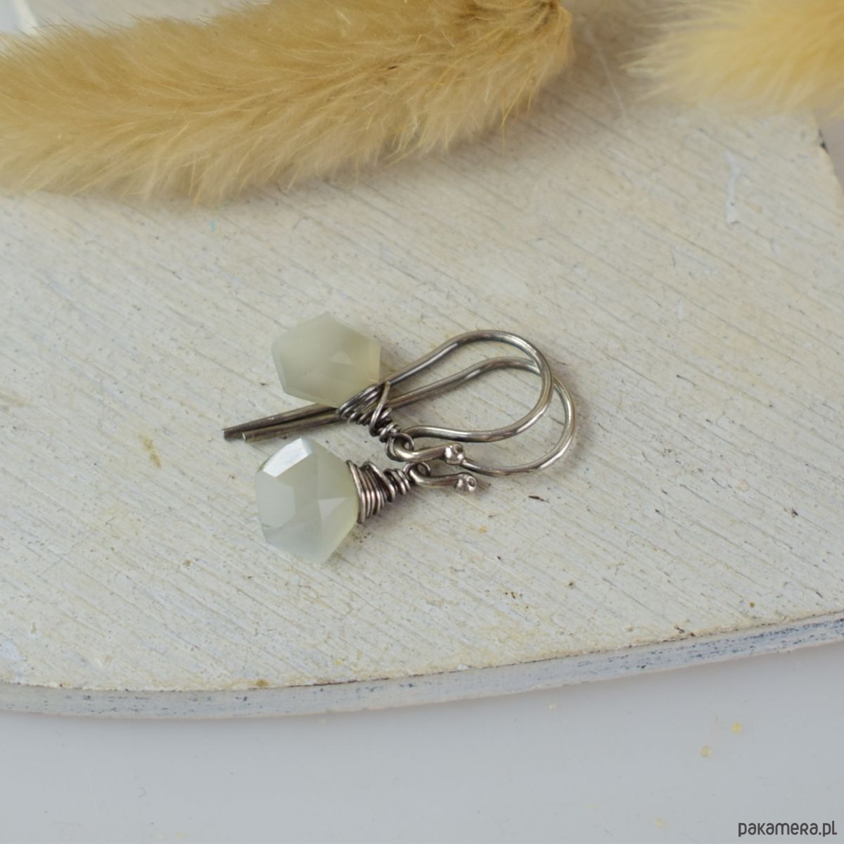 Srebrne kolczyki (srebro 925) z kroplami szarego kamienia księżycowego. Biżuteria została zoksydowana i wypolerowana. Długość całego kolczyka 2.5 cm.