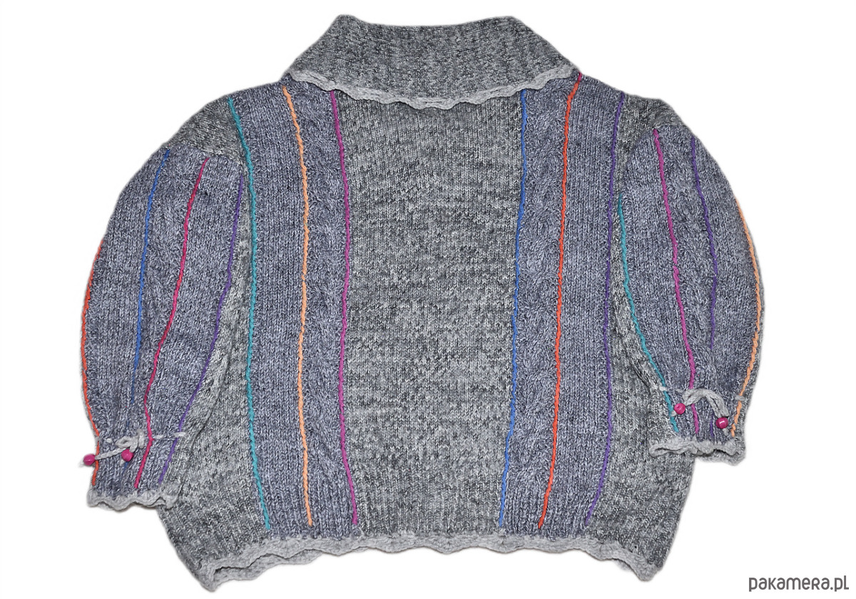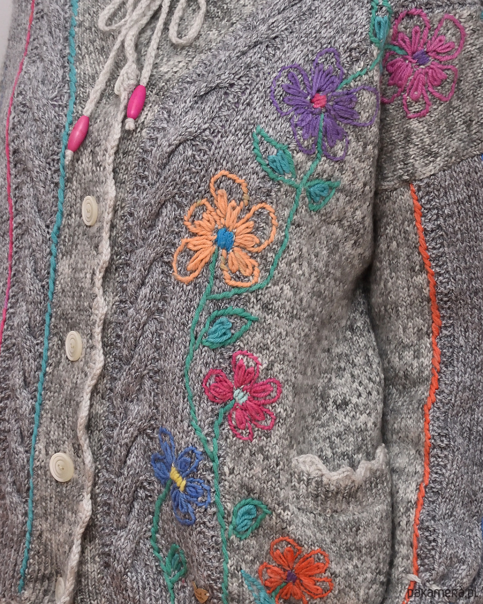 Kardigan jest wykonany z miękkiej i przyjemnej w dotyku dzianiny, pochodzącej z drugiego obiegu (mieszanka wełny i poliamidu). Wstawki przodu, tyłu i rękawów z warkoczami i haftami, zostały wykonane ręcznie z włóczki zawierającej wełnę i akryl. Podobnej włóczki użyto do haftowania.