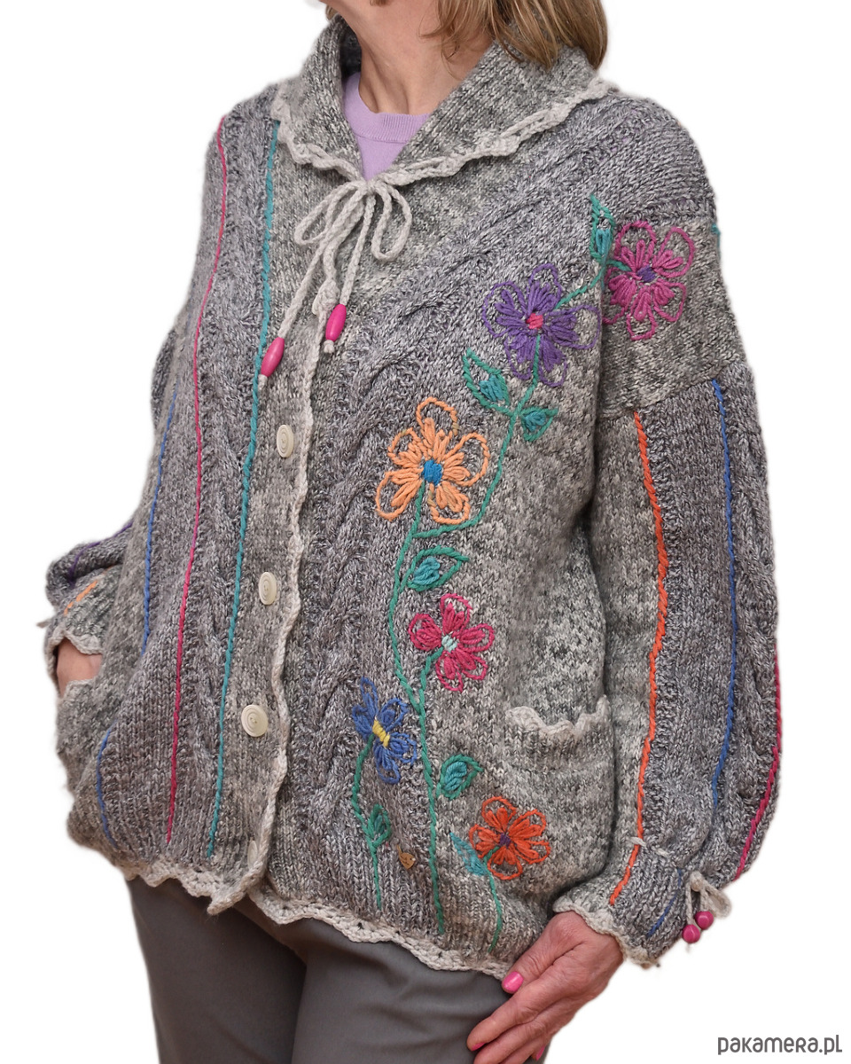 Ten kardigan w odcieniach szarości z kolorowymi kwiatami, może stać się Twoim ulubionym okryciem na zbliżającą się wiosnę. Spełni swoją rolę w chłodniejsze dni. Jest dość długi, bo zakrywający biodra. Ma luźny oversizowy krój. Posiada wygodne kieszenie i wysoki kołnierz, który po ściągnięciu wiązaniem, otuli szyję. Haftowane prążki i motyw kwiatowy sprawią, że po założeniu tego swetra nie przejdziesz niezauważona.