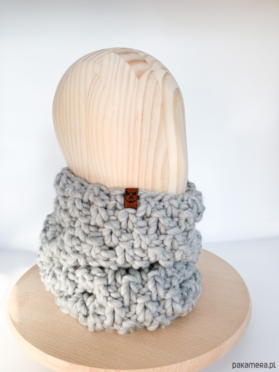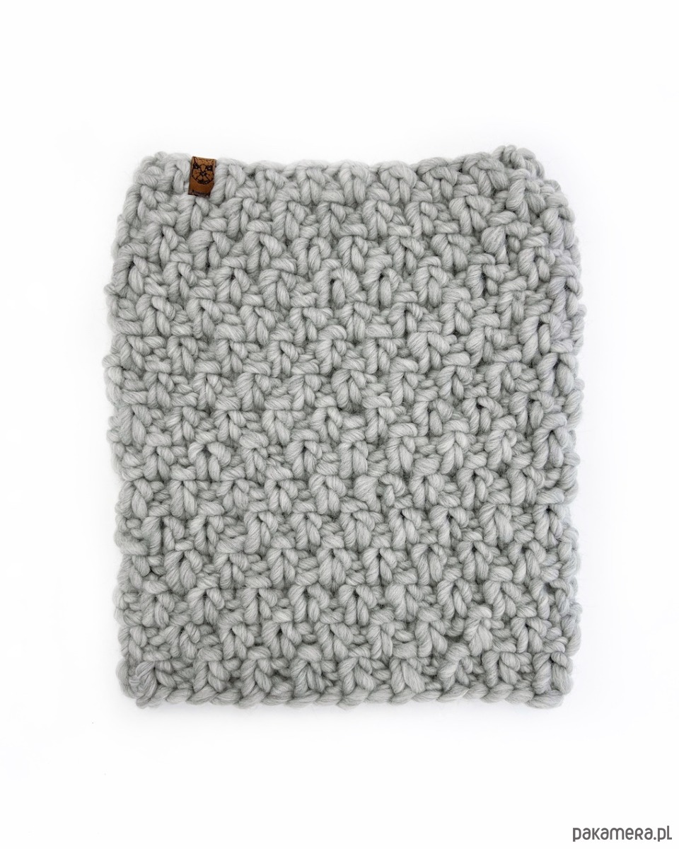 *Komin w momencie pierwszego założenia dość mocno otula szyję. W trakcie noszenia, po kilku dniach, rozciągnie się o 4-5 cm (na płasko), dzięki czemu będzie się łatwiej układał.