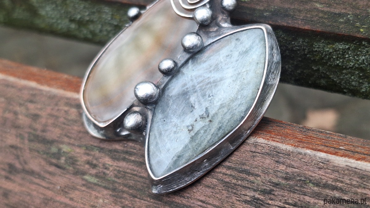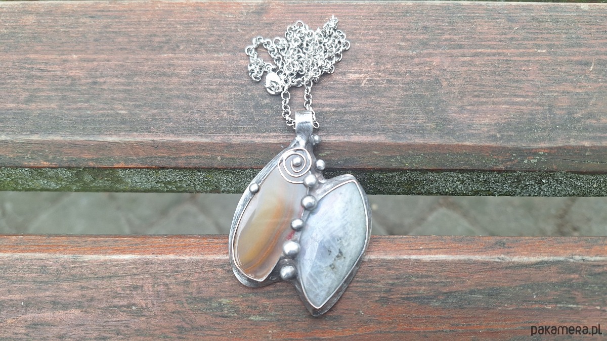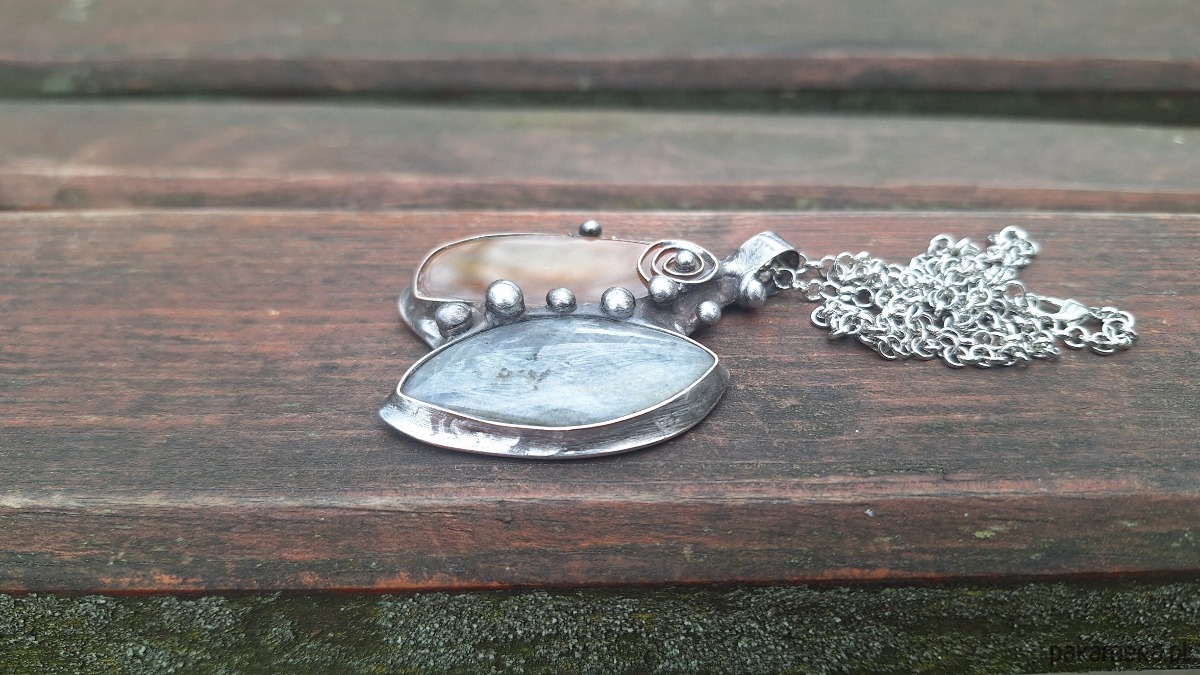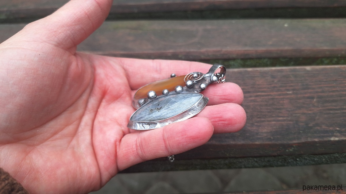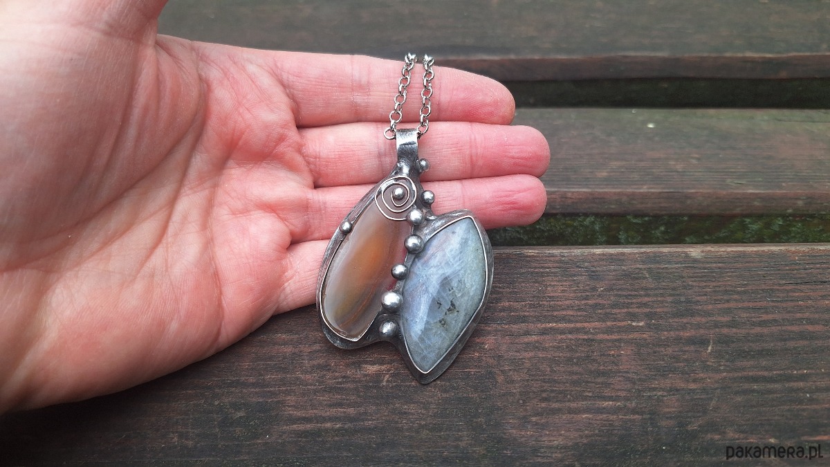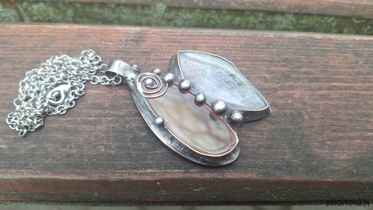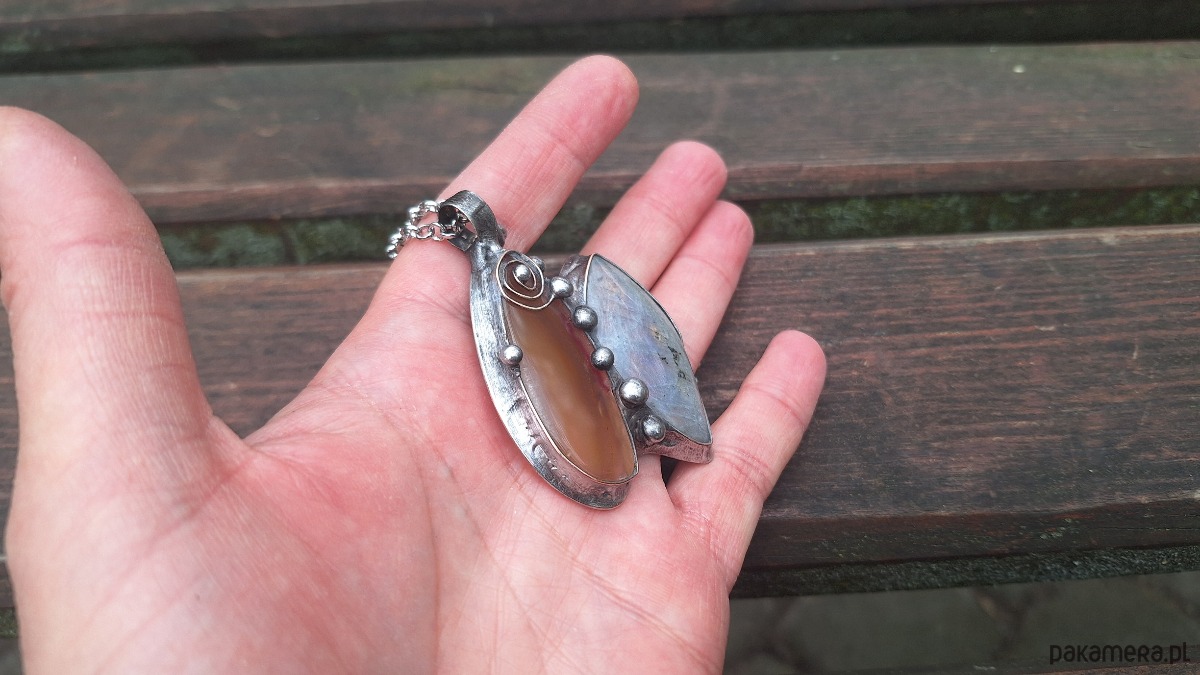 Wisiorek wykonany z miedzi, cyny, agatu i labradorytu. Wymiary ok. 6 na 4.5 cm. Zawieszony na łańcuszku o długości ok. 50 cm.