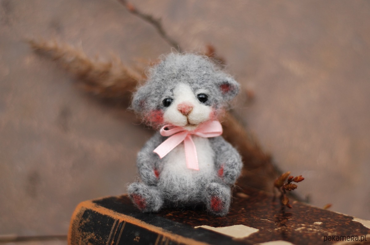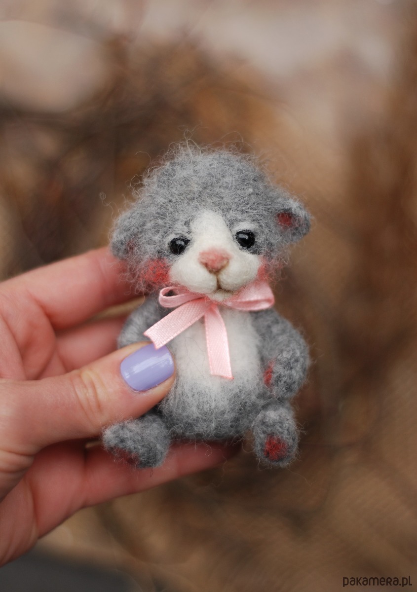 Miś wykonany metodą filcowania na sucho z wełny merynos.