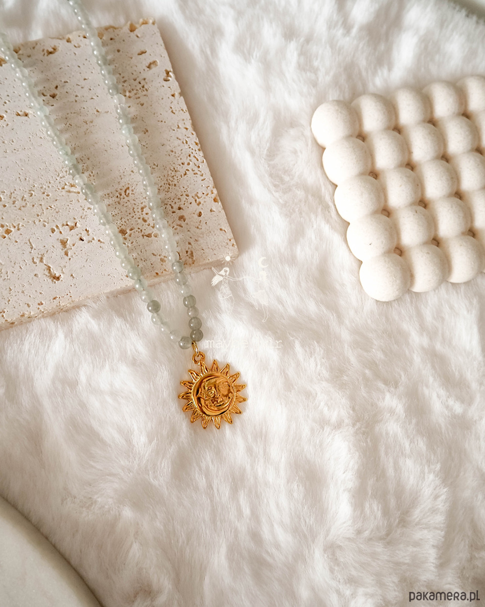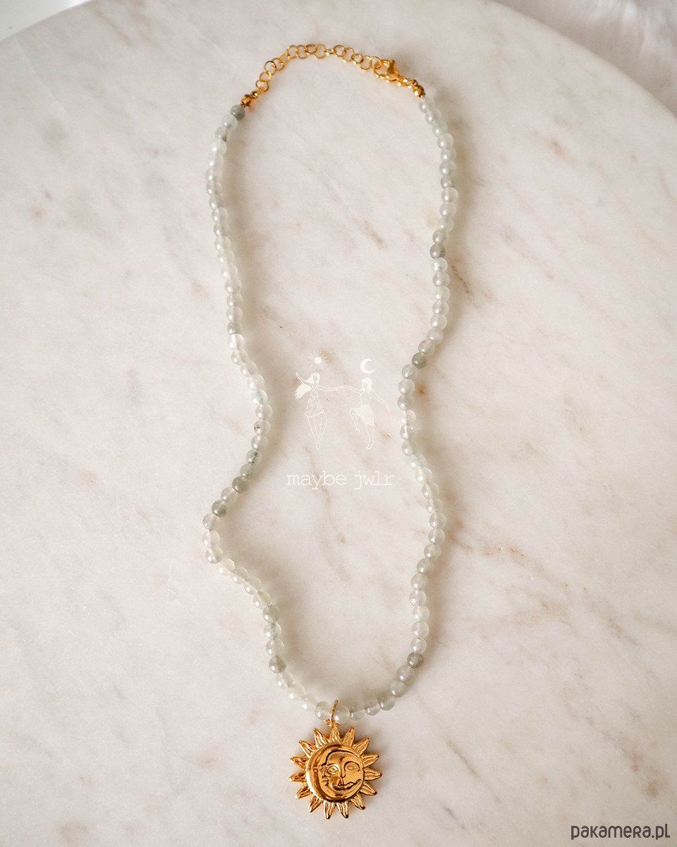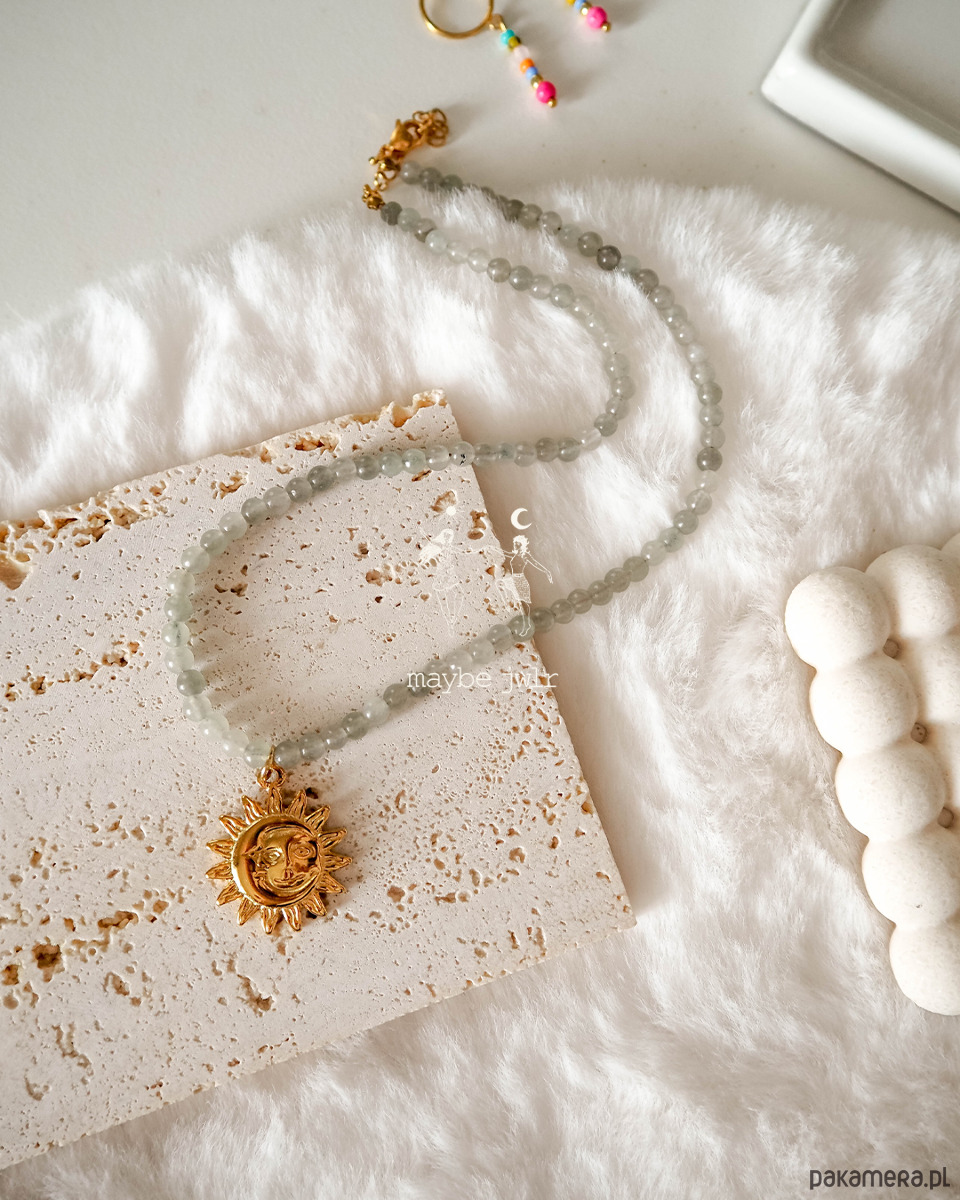 Choker wykonany z szaro zielonych kamieni naturalnych jadeit o wielkości 4mm, jest przeplatany drobnymi koralikami.
