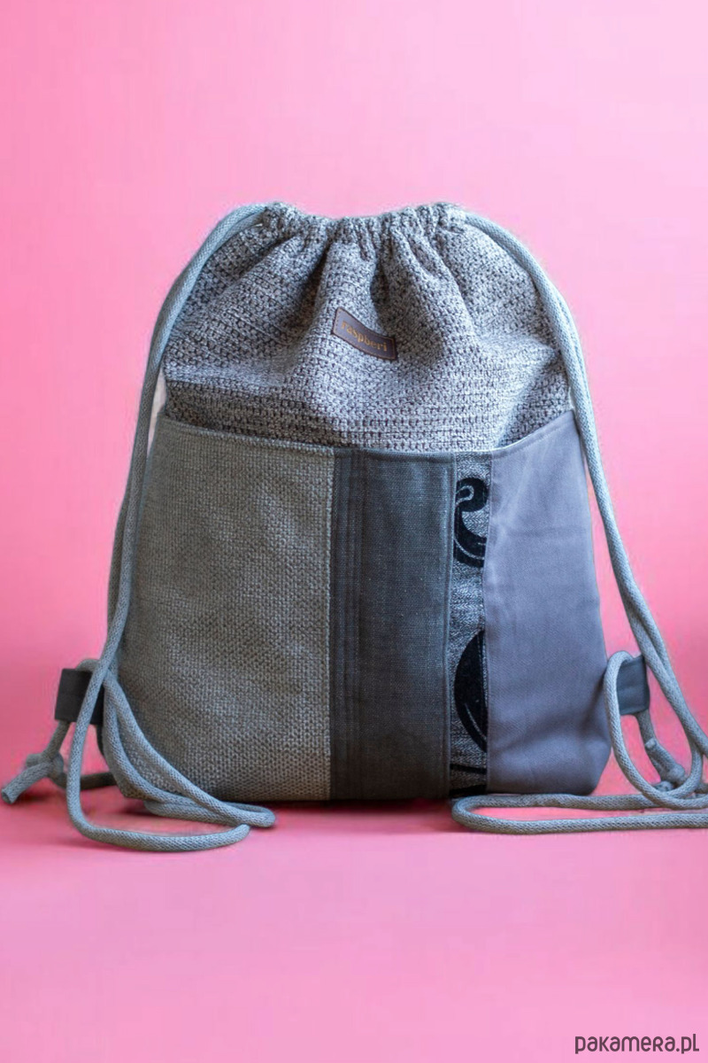 Workoplecak z plecionej tkaniny w kolorze szarym.