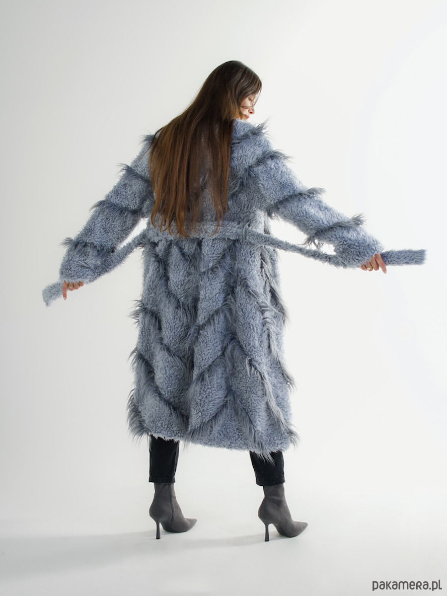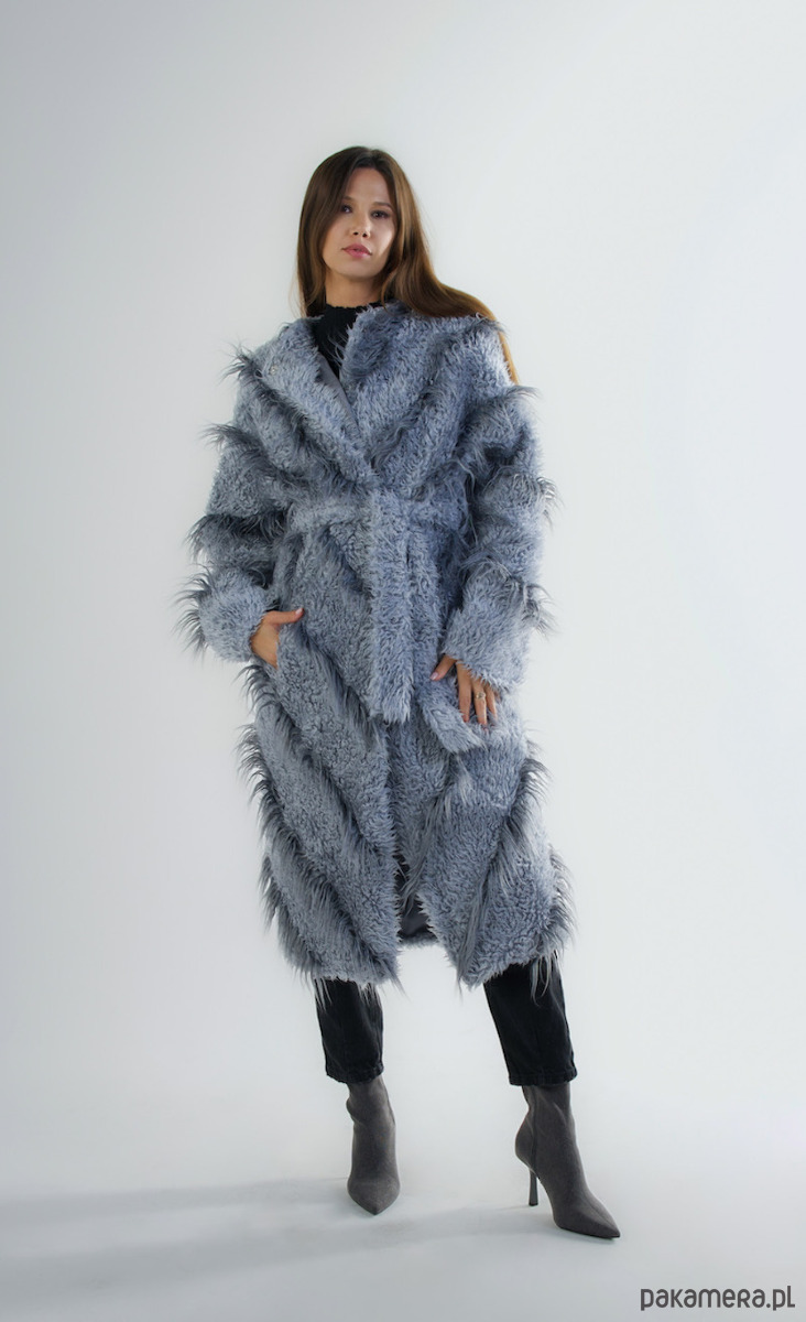 Szary płaszcz ze sztucznego futra to propozycja z naszej najnowszej kolekcji. Zapinany na zatrzaski z możliwością przewiązania paskiem w talli. Posiada pojemne kieszenie.