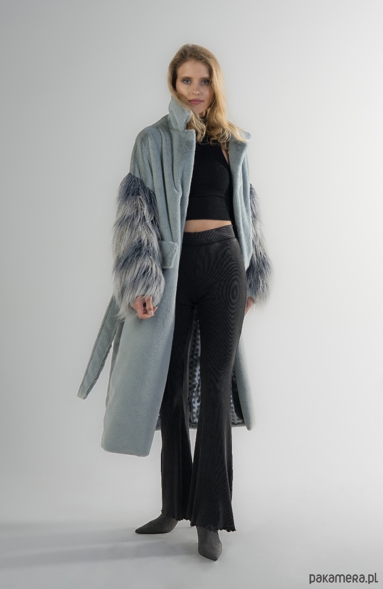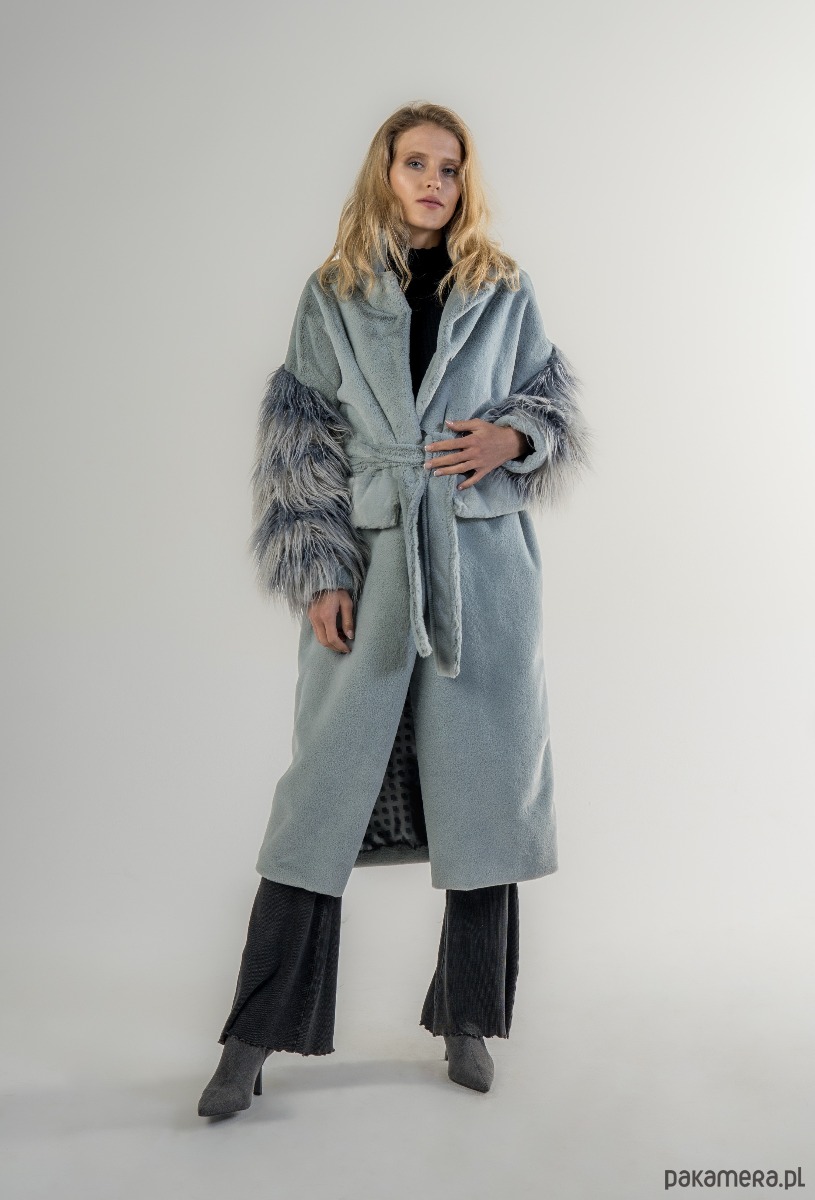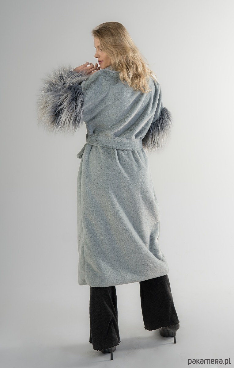 Szary płaszcz ze sztucznego futra z puszystymi rękawami