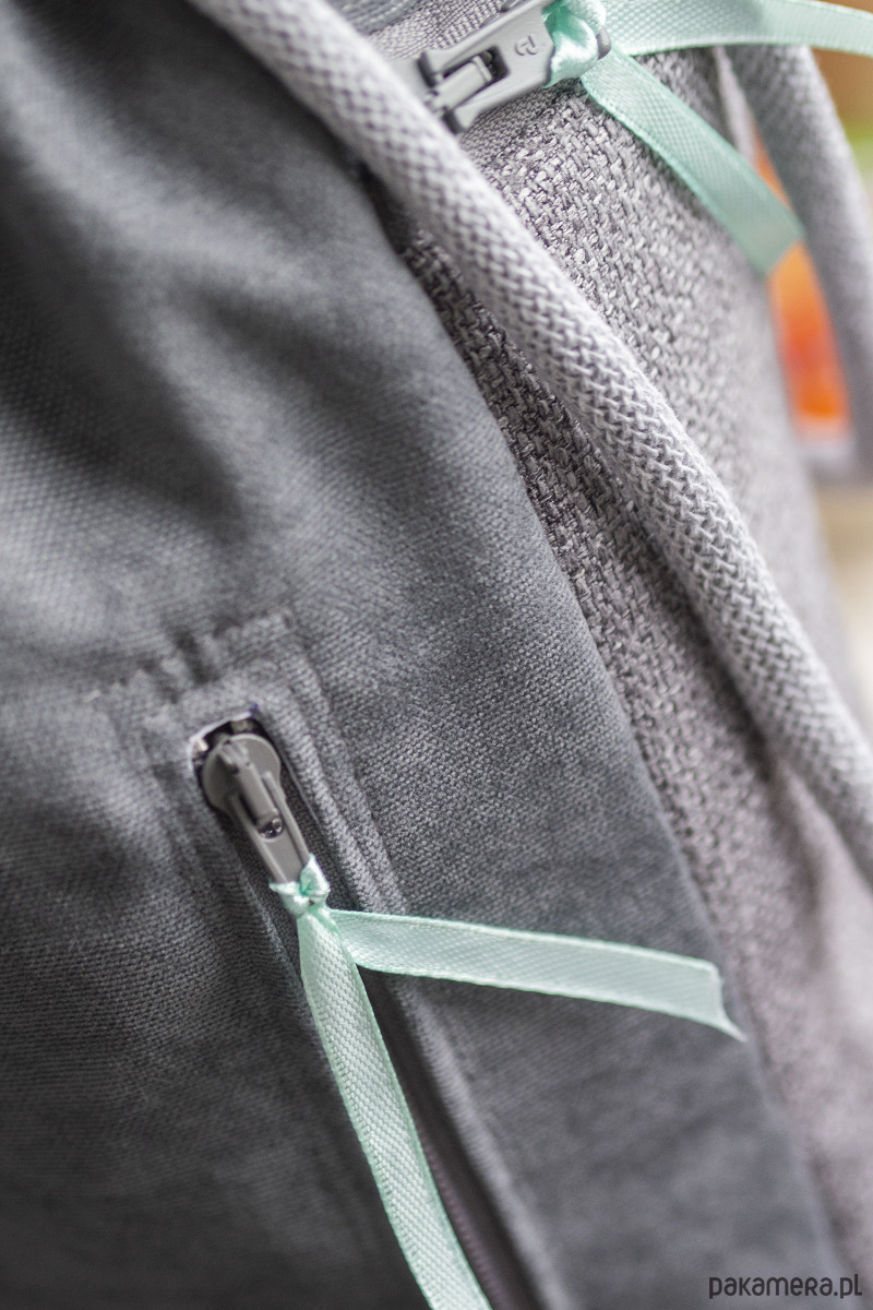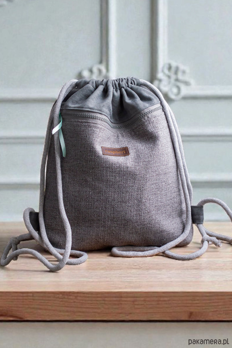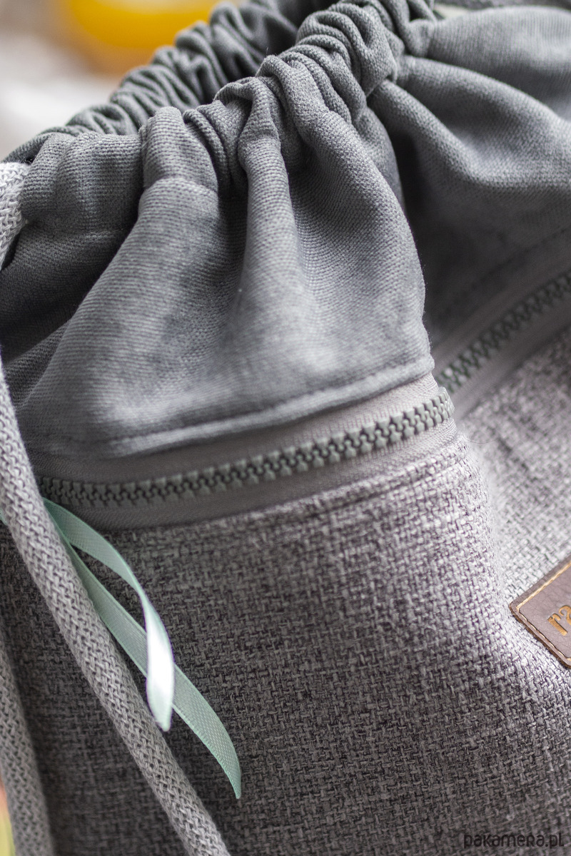 Plecak worek wykonany z szarej tkaniny. Z przodu duża kieszeń zapinana na suwak. Z tyłu plecaka (z boku, na dole) mała zapinana kieszonka.
