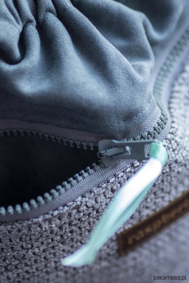 Plecak worek wykonany z szarej tkaniny. Z przodu duża kieszeń zapinana na suwak z ciemnej plecionki. Z tyłu plecaka (z boku, na dole) mała zapinana kieszonka.