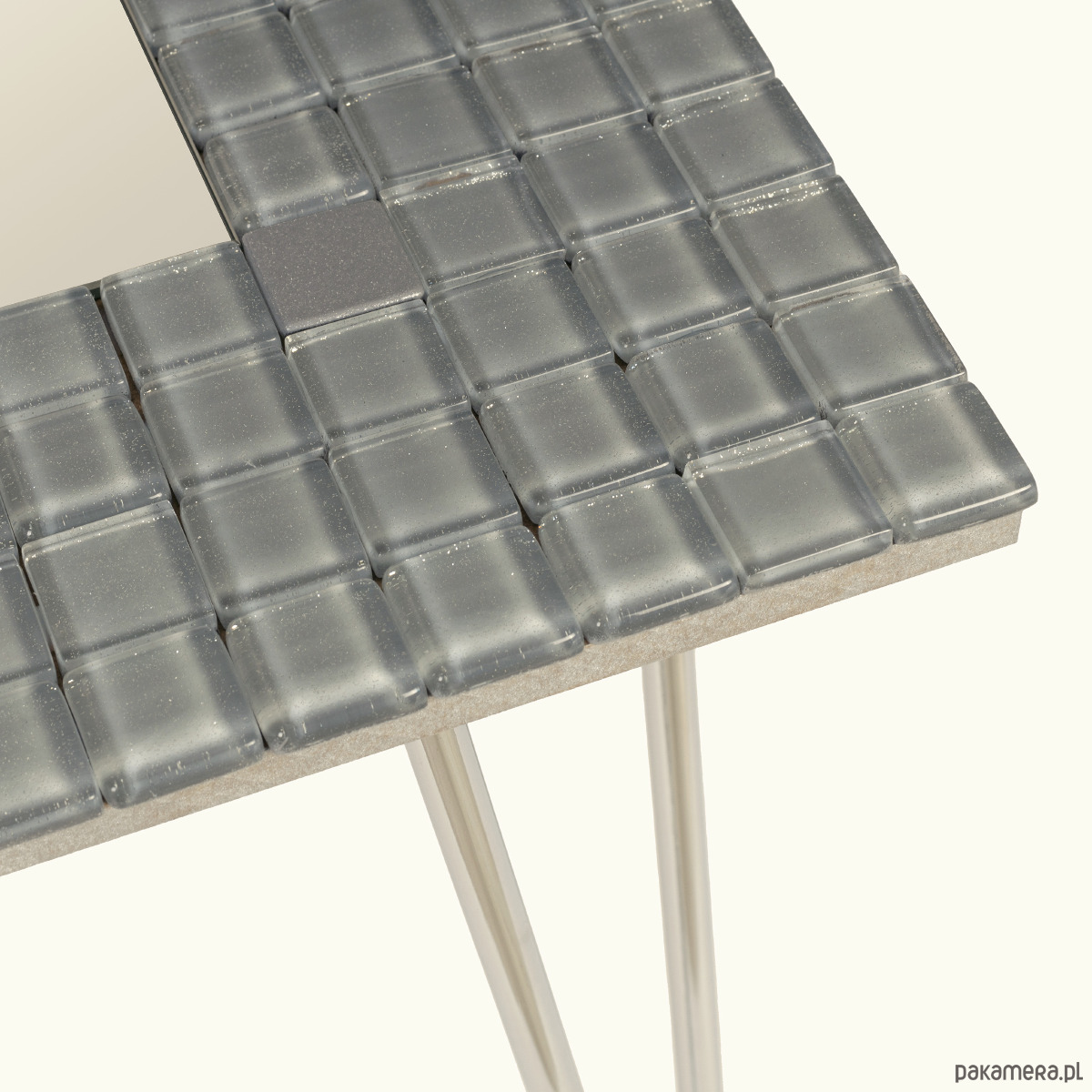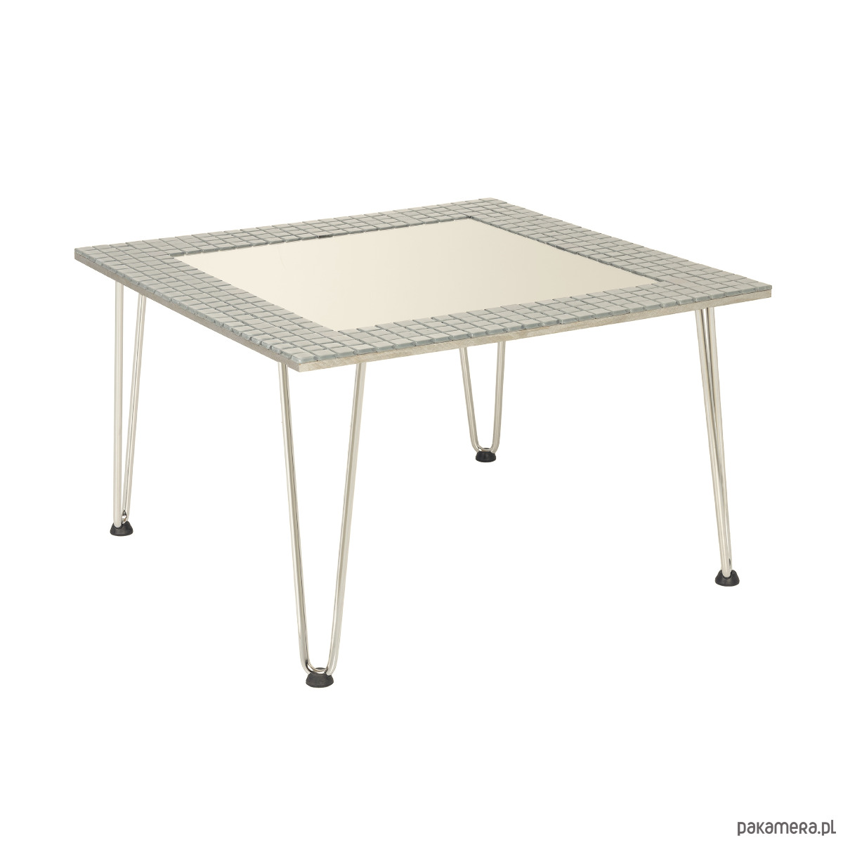 Stolik kawowy, kwadratowy Sarto wyłożony szarą, szklaną mozaiką z 4 chromowanymi nogami typu hairpin