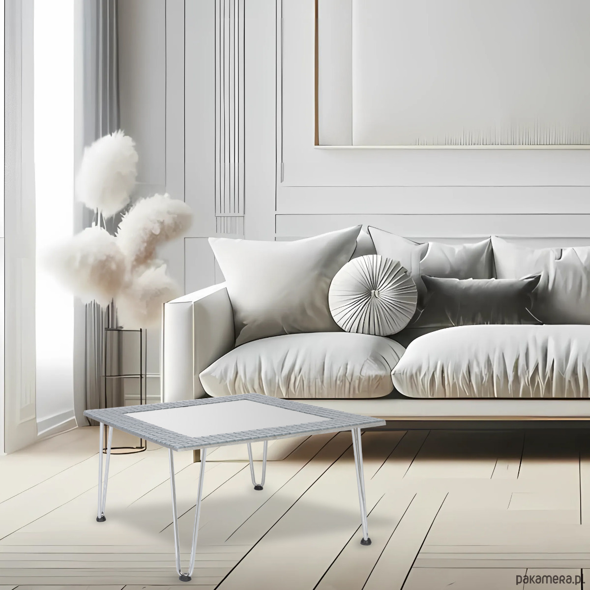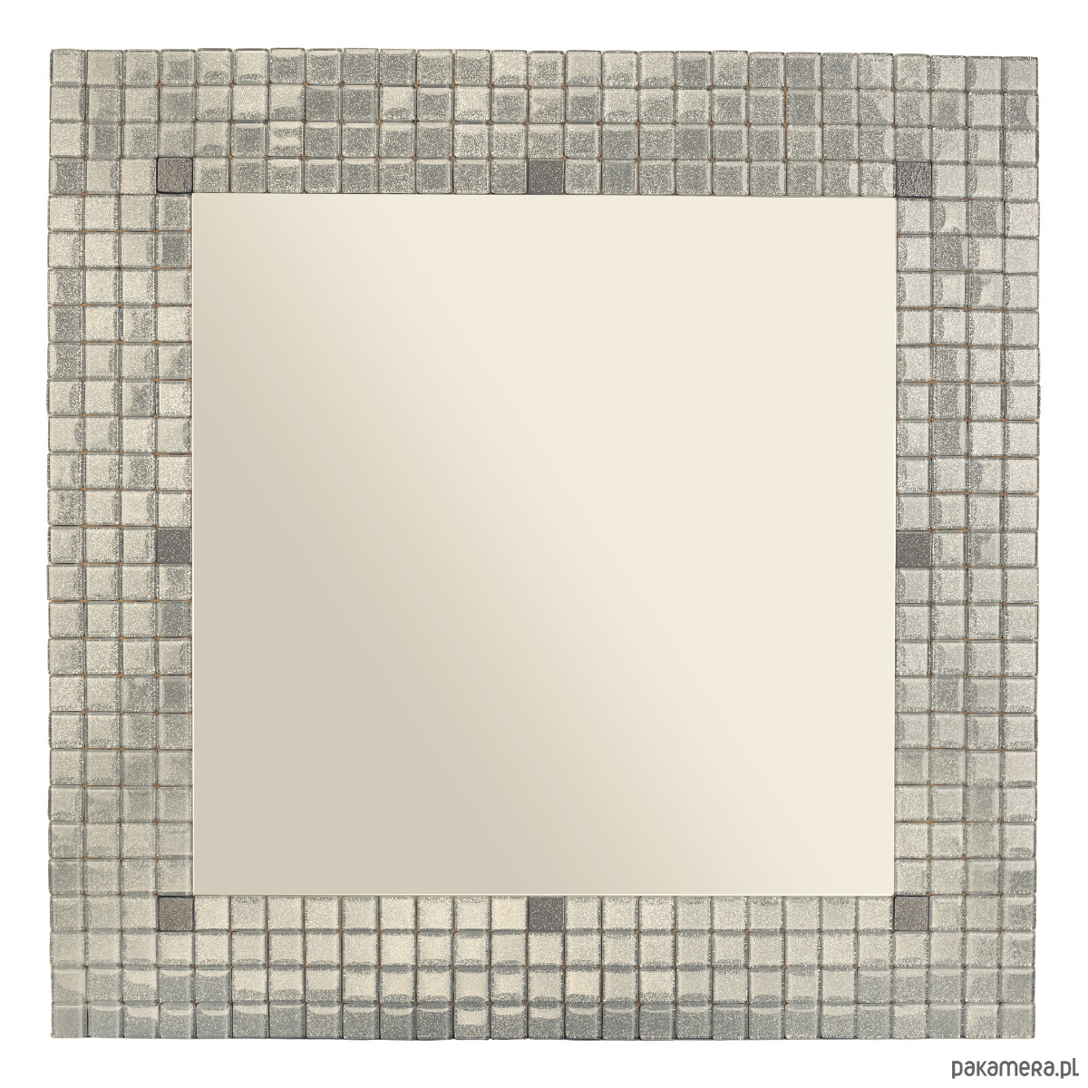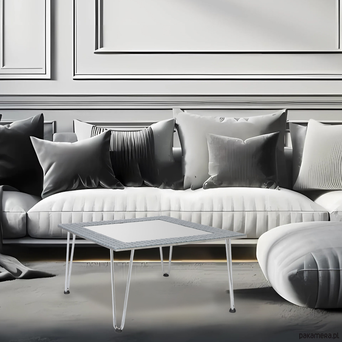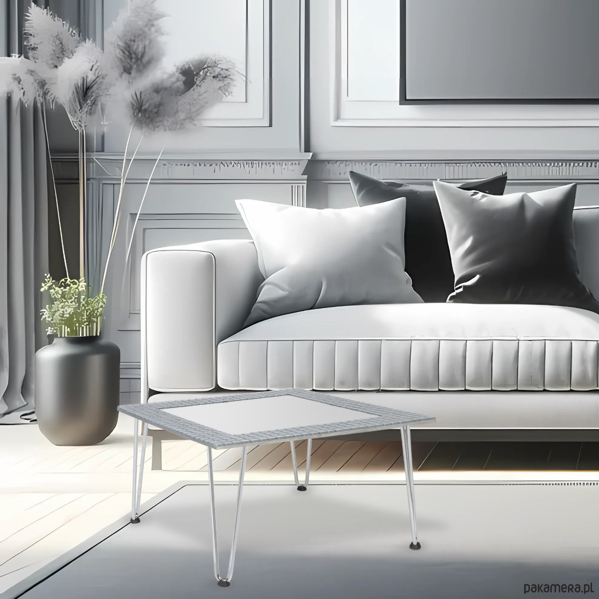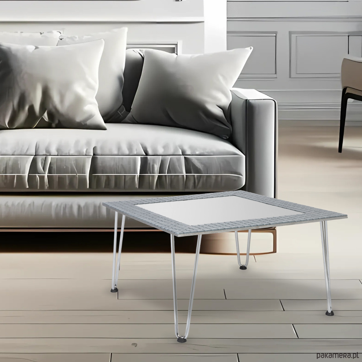 Dekoracyjny kwadratowy stolik kawowy Sarto otoczony szarą, błyszczącą, brokatową mozaiką z kontrastowymi kostkami w kolorze szarym matowym. Matowa mozaika umieszczona w kilku punktach wyraźnie zaznacza granice wewnętrznego obrysu lustra i nadaje indywidualnego charakteru.