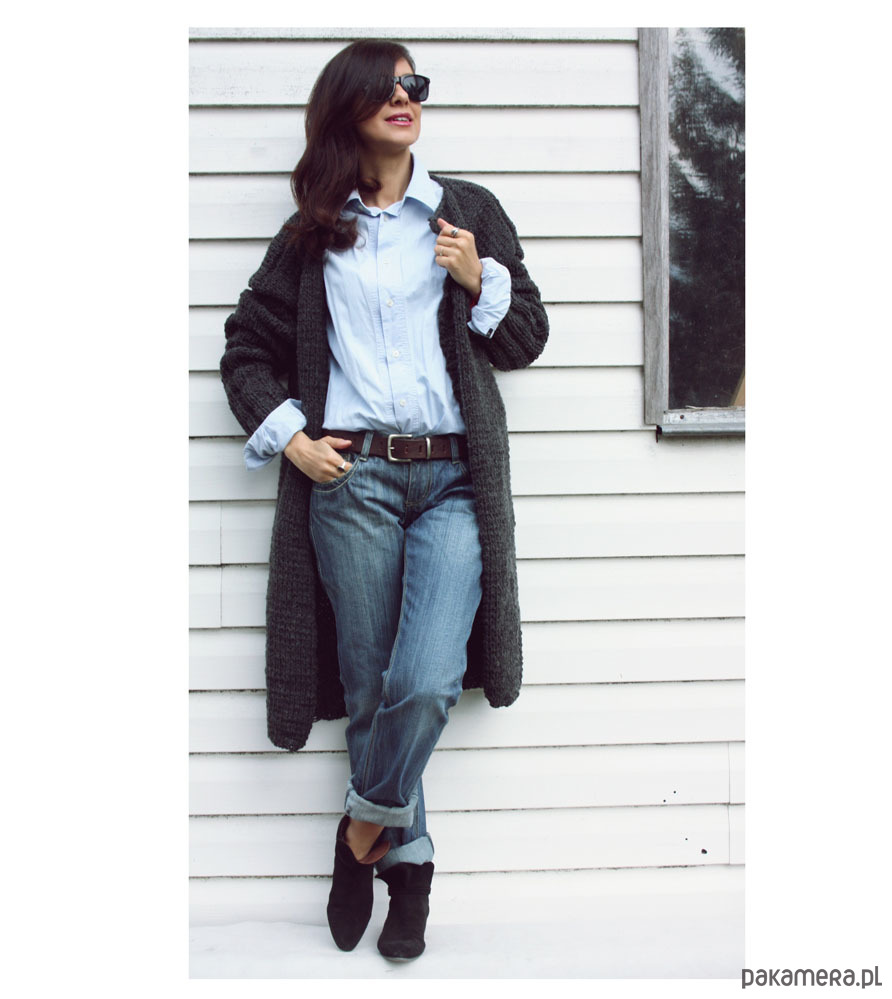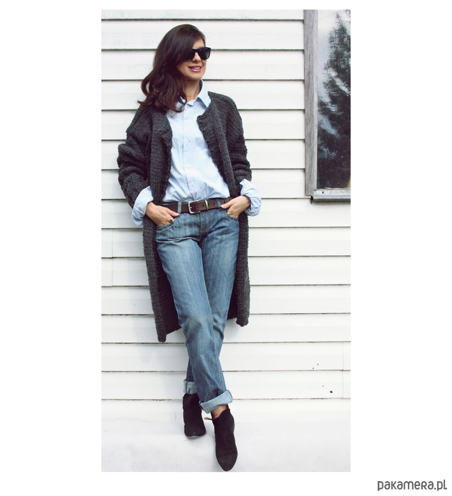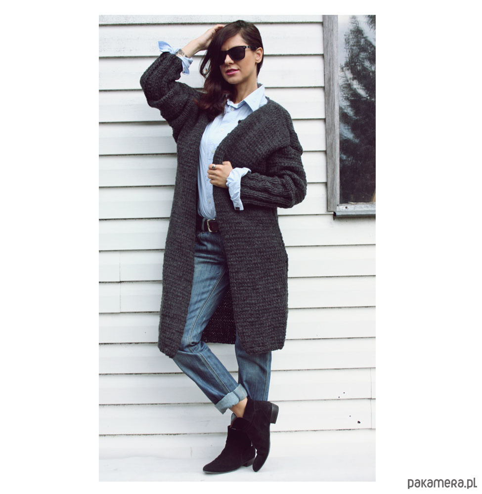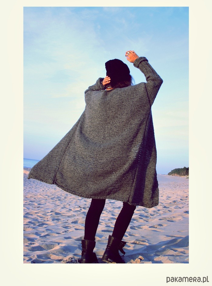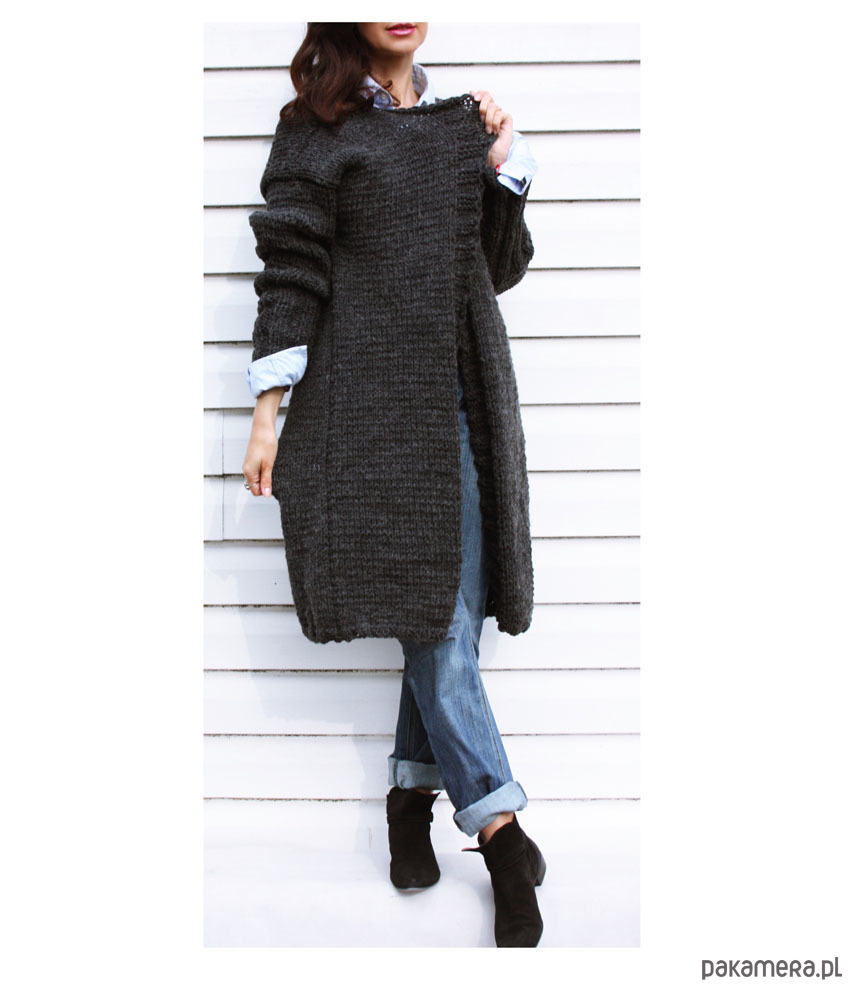 Ręcznie wykonany długi sweter oversized, kolor szary.