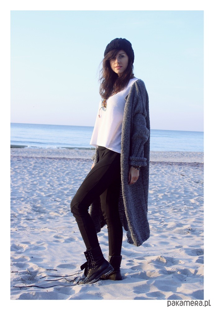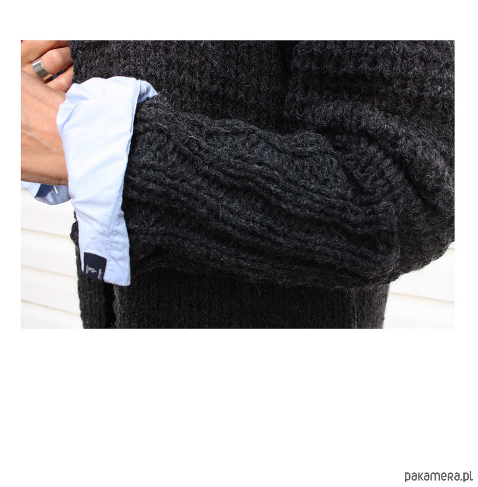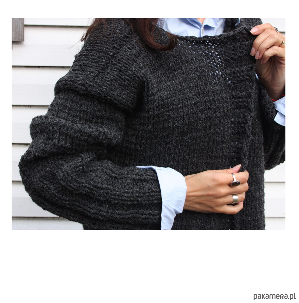 Sweter jest bardzo szeroki, nie posiada zapięcia.