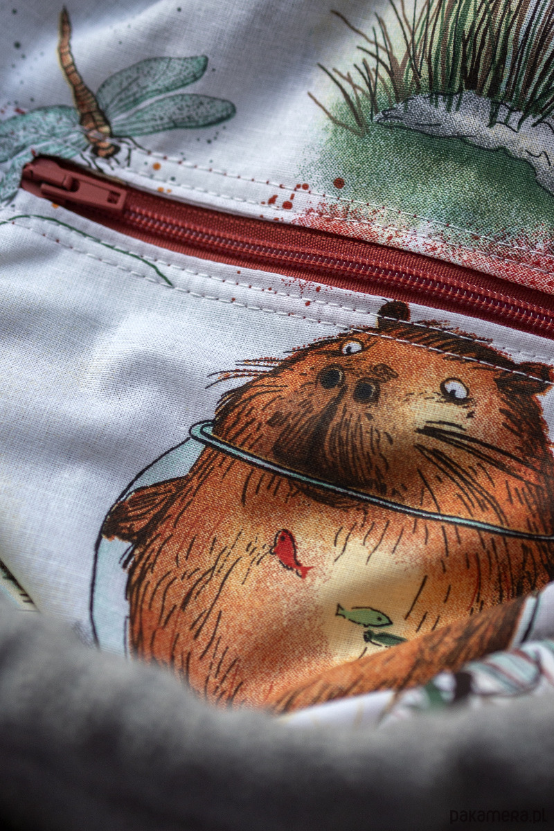 Wzorzysta bawełniana podszewka w kapibary. Kieszonka w środku.