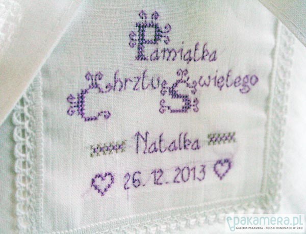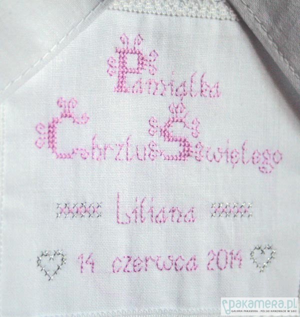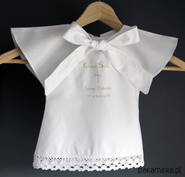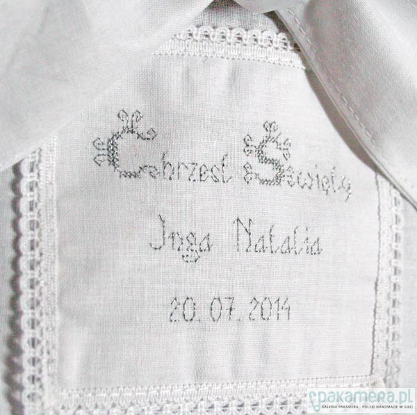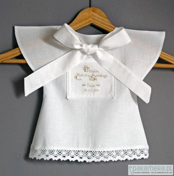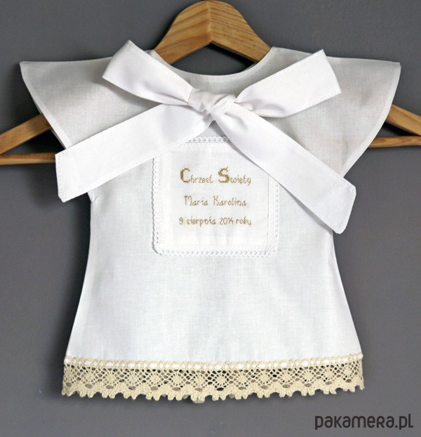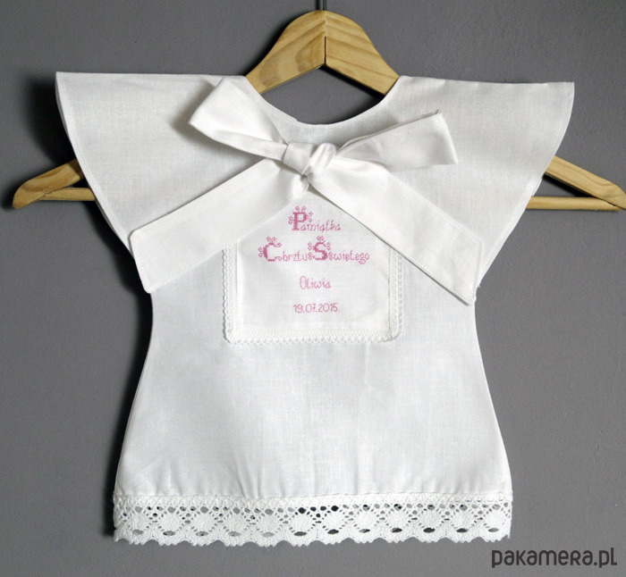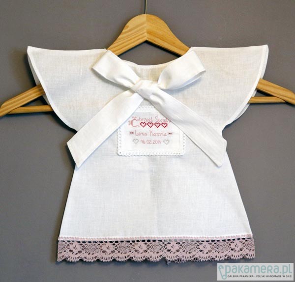 Bawełniana szatka do Chrztu Świętego ręcznie haftowana, wykończona bawełnianą koronką w trzech kolorach do wyboru - białym, różowym bądź ecru. Szatka o wymiarach około 33/30 cm, 21 cm w klatce piersiowej. Rozcięcie z tyłu, wiązana na tasiemkę. Piękna, stylowa pamiątka Chrztu Świętego. Po dokonaniu zakupu proszę o podanie koloru koronki oraz treści i koloru haftu. Koronka może różnić się od tej ze zdjęć.