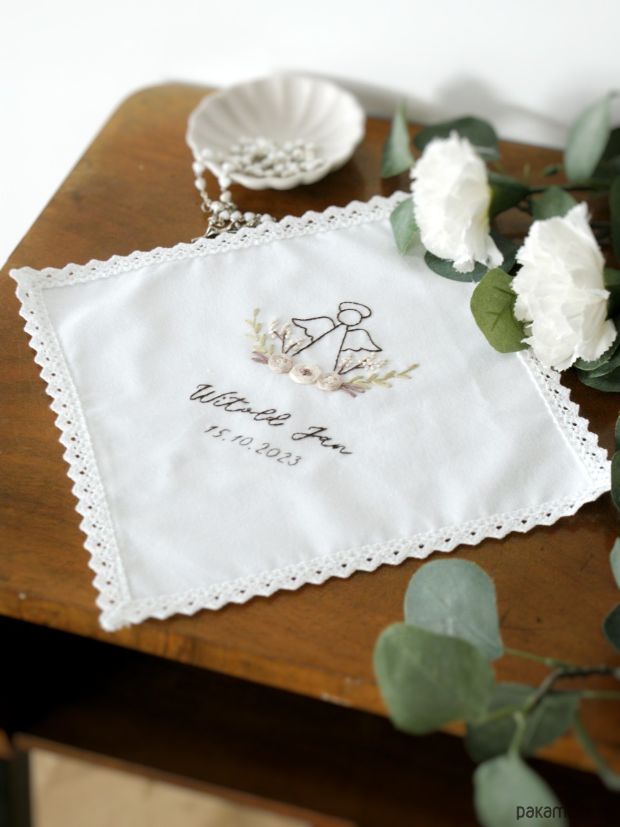 Szatka z aniołkiem, imionami dziecka i datą - na zamówienie.